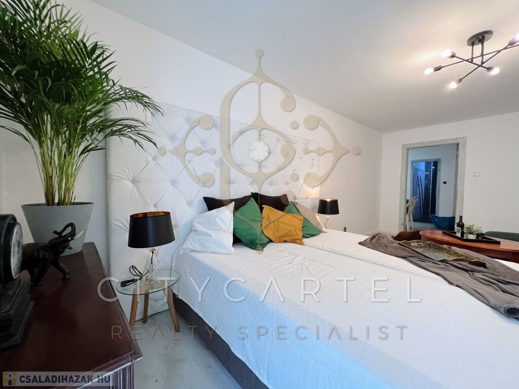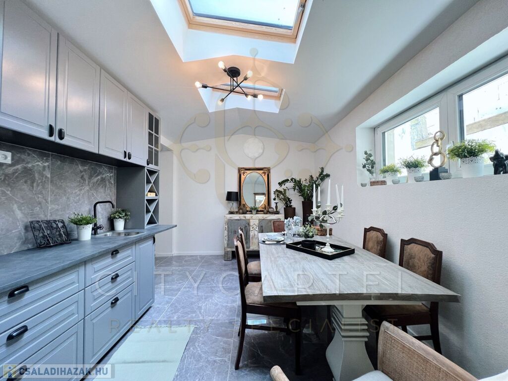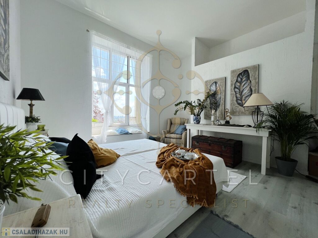 Az emeleten található egy kétszintes, étkező-konyha + 6 szobás (alsó szinten panorámás nappali nagy ablakokkal, 3,5 m belmagassággal, 2 szoba, fürdőszoba, vendégfürdő, mosókonyha – felső szinten 3 szoba, 2 fürdőszoba) vintage hangulatú lakosztály, amelynek legfelső emelete akár még tovább szeparálható. A tetőtér vörösfenyő gerendázatú, 25 cm paplan szigeteléssel biztosítja a kellemes klímát.