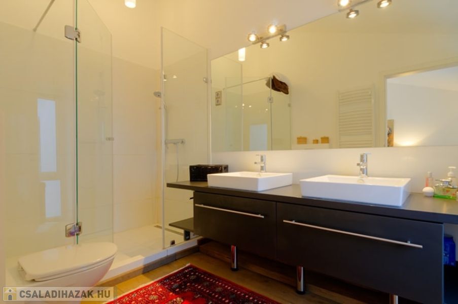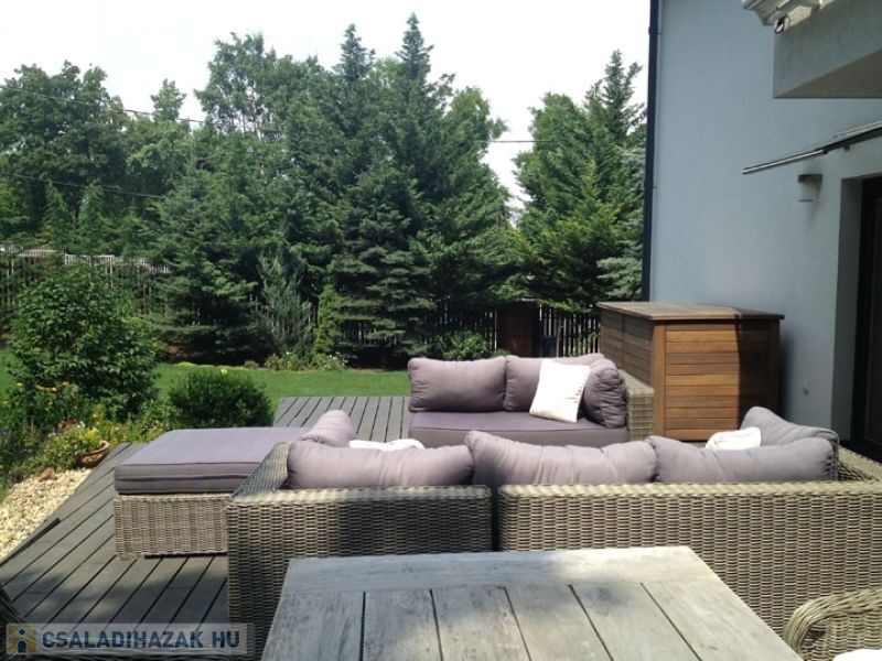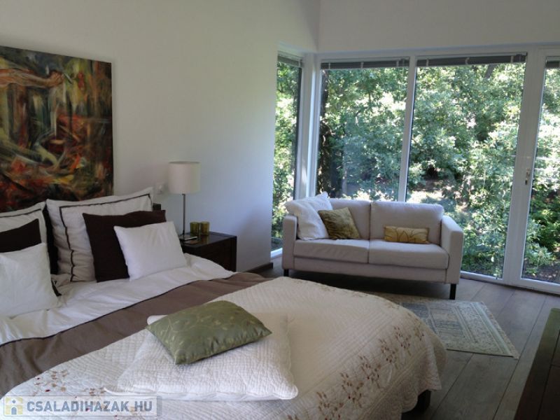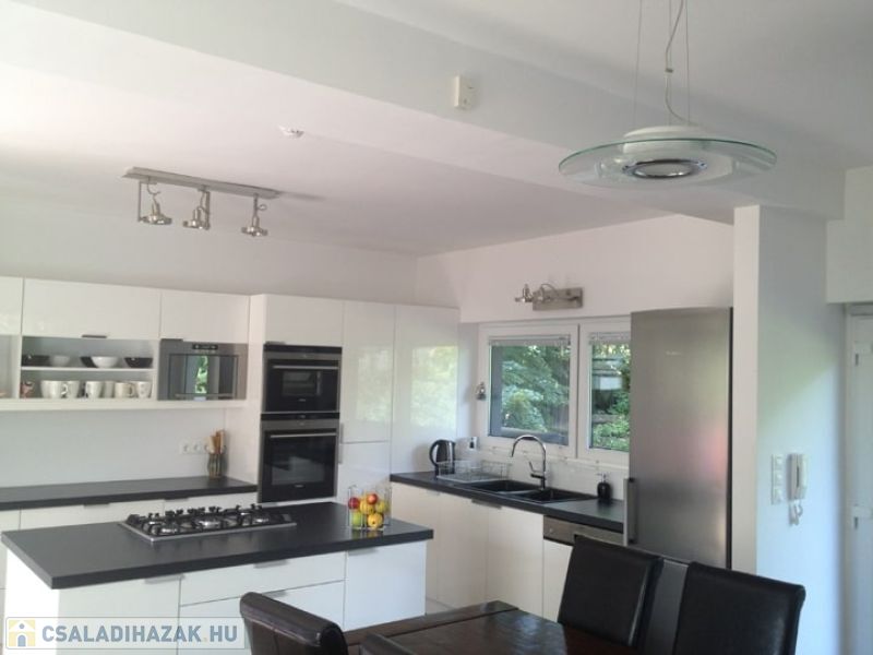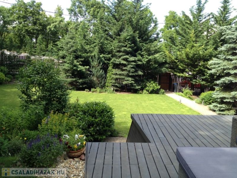 300m²-es, 5 hálószobás, 3 fürdőszobás, újjáépített és felújított ház, dupla garázzsal. Sík 1400m²-es saroktelken található, érett parkosított önálló kerttel. Az ingatlan az erdővel határos.