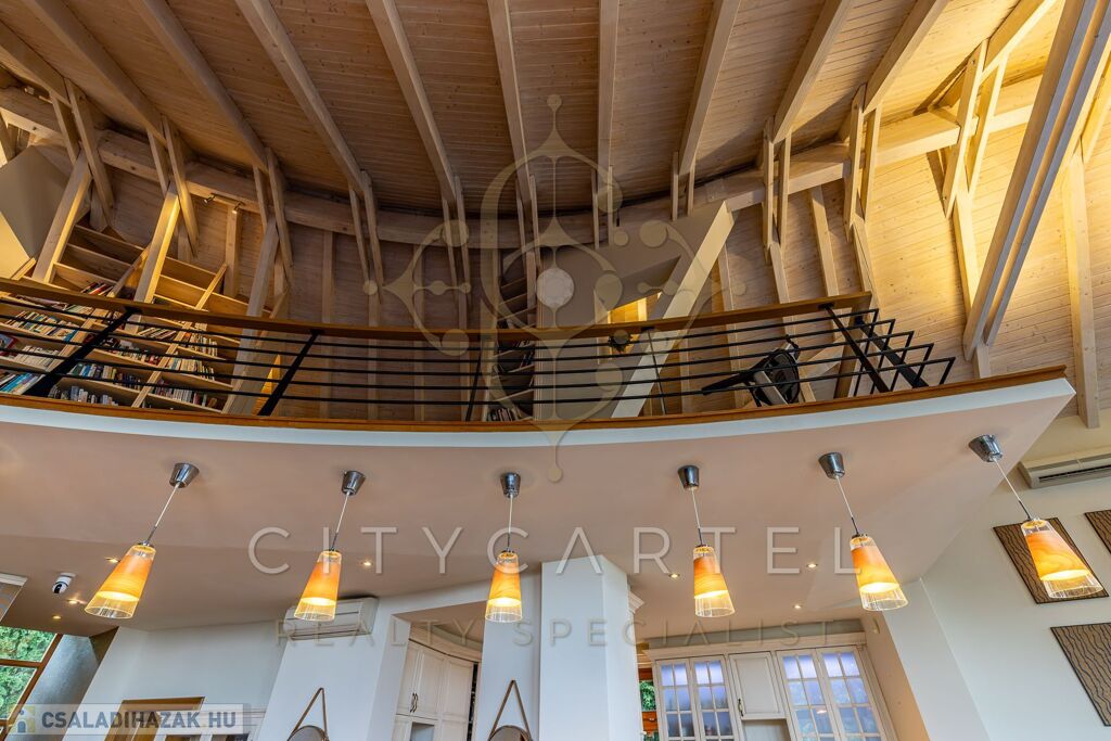 Galériás könyvtár / konditerem / társalgó, 2 hálószoba franciaerkéllyel és gardróbbal, nagyméretű fürdőszoba, tároló