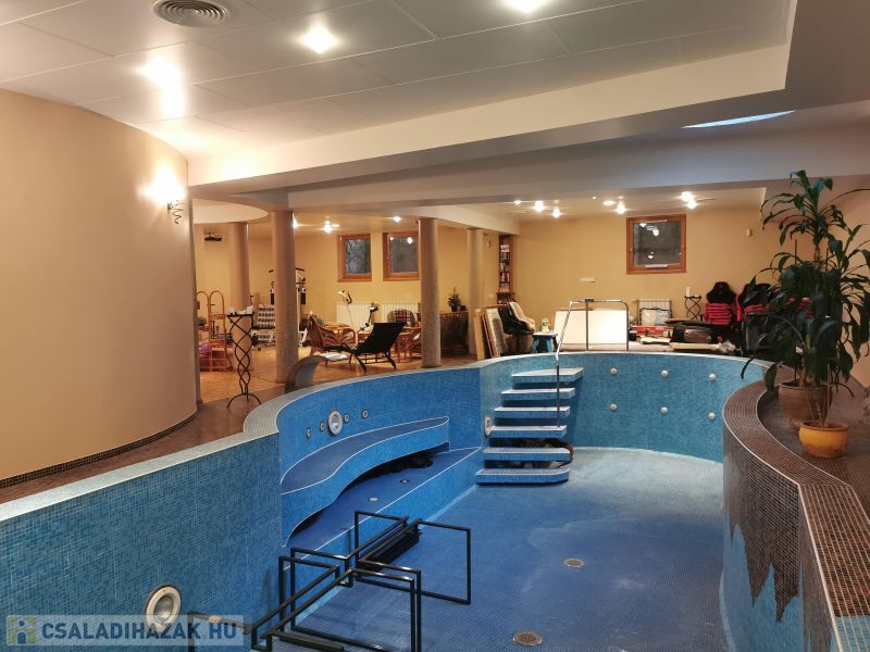 * Alsó szint 260 m2: garázs, wellnesz rész: nagy méretű belső medence, finn és infraszauna, merülő dézsa, fitneszrész, társalgórész