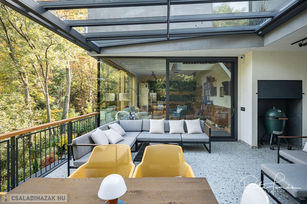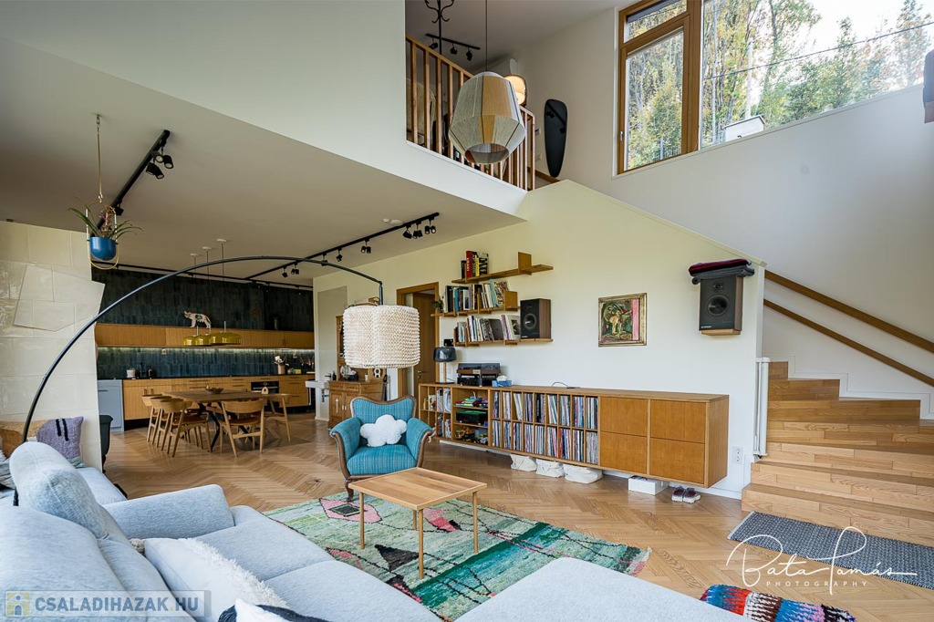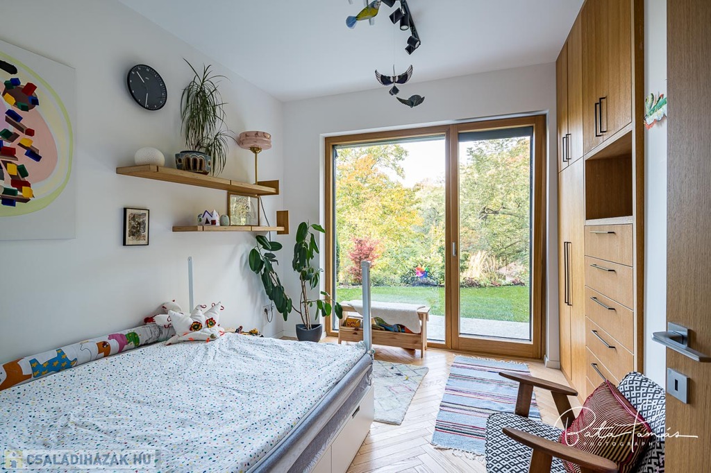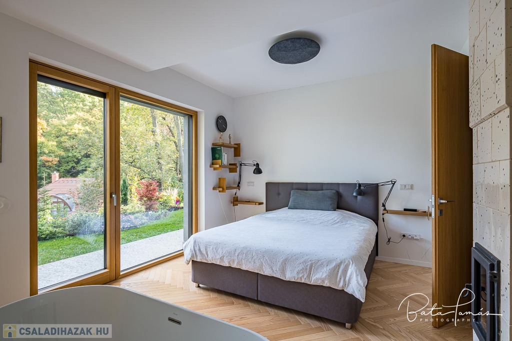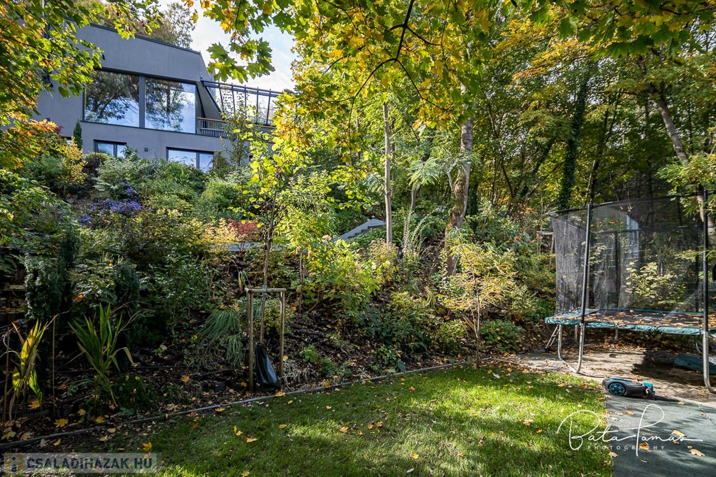 Kivételes természetközeli élmény és magas műszaki tartalom Svábhegy csendes részén! Budapest XII. kerületében, a Svábhegy és Zugliget találkozásánál, csodálatos természeti környezetben, mégis jó tömegközlekedési lehetőségekkel ellátott területen, a Mátyás király út egyik csendes mellékutcájában található ez az újépítésű, modern ikerház. Az ingatlan nyugodt zöldövezeti panorámával, ideális alaprajzzal és modern külső megjelenéssel bír. Az épületet 500 m²-es botanikus kert övezi, egzotikus növényekkel beültetve, amely a gyermekek számára homokozót és trambulint is kínál. Az épület formatervezése tökéletesen illeszkedik a telek természetes domborzatához. Az ingatlan összesen 222 m² nettó lakóterülettel rendelkezik, két teljes értékű szinten, amelyekhez egy 66 m²-es napozó és pihenőterasz is kapcsolódik szaunával és kültéri zuhanyzóval. Minden szobából közvetlen kijárat nyílik a kertbe. A szülői hálószobából elérhető egy fafűtésű dézsafürdő, amely biztosítja a természetközeli felfrissülést. Az impozáns méretű, nagy belmagasságú nappali-konyha-étkező tér lenyűgöző panorámával és hatalmas üvegfelületekkel teremt egyedi, szinte lombház-szerű élményt, amely harmonikusan egyesíti a belső és külső tereket. Az ingatlan minden apró részletét a tulajdonos gondos tervezése és kivitelezése tükrözi, a minőségi anyaghasználat és a felsőkategóriás műszaki megoldások pedig a maximális komfortot szolgálják. Műszaki jellemzők: • 25 cm külső hőszigetelés • Mennyezeti hűtés-fűtés és padlófűtés helyiségenkénti szabályozással, távoli elérhetőséggel (Rehau) • Szintenként egyedi tervezésű, fa tüzelésű cserépkályha • Háromrétegű, biztonsági üvegezéssel ellátott nagyméretű tölgy nyílászárók, alumínium burkolattal, motoros redőnyökkel és szúnyoghálókkal (Schlotterer) • Központi időkapcsolós, külmotoros szellőztető rendszer • Csúcskategóriás konyhai gépek: Bosch főzőlap, sütő, mosogatógép, hűtőszekrény, Electrolux borhűtő • Vízlágyító és tisztító berendezés • Magas minőségű szaniterek és csaptelepek (Laufen, Hansgrohe) • Gira kapcsolók és konnektorok • 9 rétegű valódi kőrisfa parketta (padlófűtés kompatibilis) • Háromfázisú elektromos autótöltési lehetőség • Távfelügyeletre kötött, magas szintű biztonsági rendszer (éjjellátó kamerák, infra csapdák, mozgásérzékelők) Helyiségek elrendezése: • Nappali szint: Tágas előtér, gardrób, amerikai konyhás nappali-étkező nagy belmagassággal, kamra, vendég mosdó, 66 m²-es, zavartalan használatot biztosító terasz nyári konyhával és napozó résszel. • Hálószoba szint: Három tágas hálószoba, egy dolgozószoba, járható gardróbszoba és két fürdőszoba. Az épülethez tartozik egy garázs, valamint egy felszíni beállóhely is. Ez a páratlan ingatlan kivételes természeti környezetben, magas szintű kényelmet és otthonosságot biztosít, ahol minden készen áll a beköltözésre.