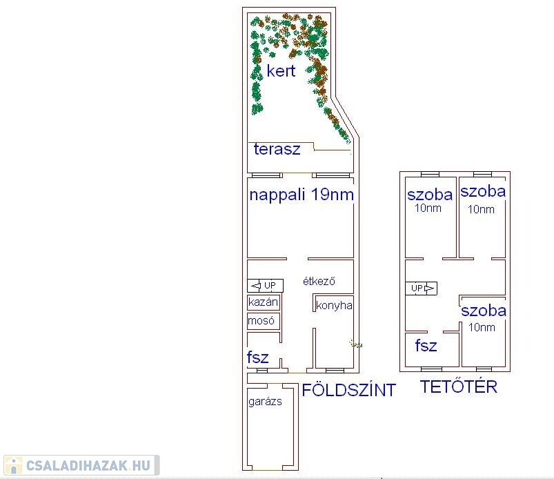 Földszínt: Kertkapcsolatos nappali, előszoba, étkező, konyha, fürdőszoba, mosókonyha, kazánház, közlekedő.