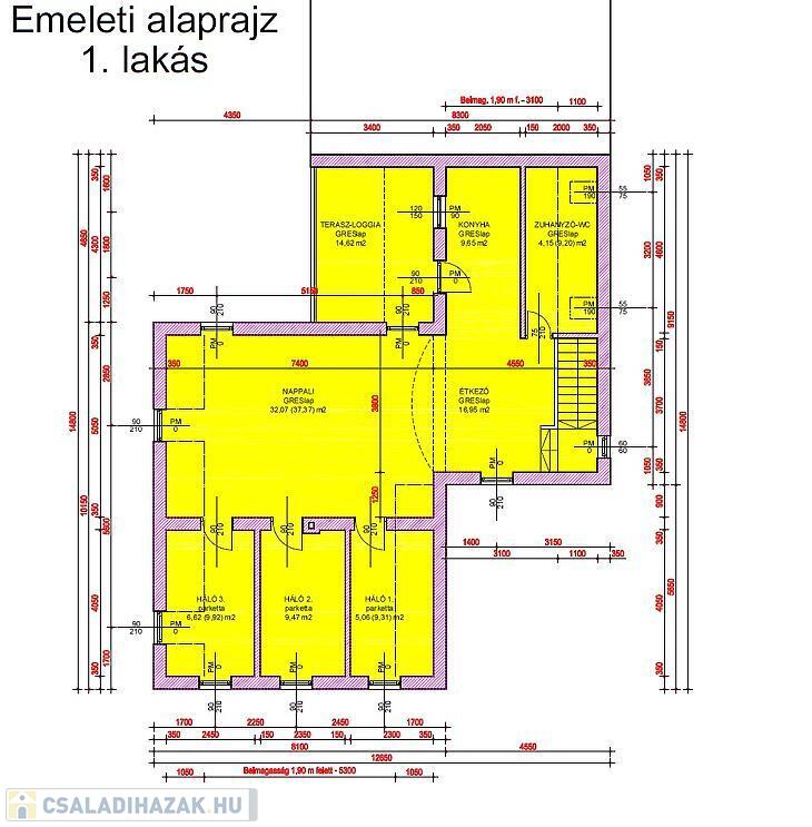 A földszinten előtér, szoba, mellékhelyiség és egy 15 m2-es erkély található. Az emeleten tágas amerikai konyhás nappali, 3 szoba, egy nagyobb fürdőszoba (kád és zuhanyzó is van benne) és egy 15 m2-es erkély került kialakításra.