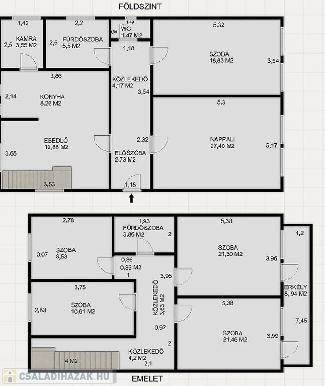 A földszinti részen, konyha, nappali, étkező, szoba, kamra, közlekedő, fürdőszoba, mellékhelyiség és terasz található. Az emeleten 4 szoba, hall, fürdőszoba és erkély került kialakításra.