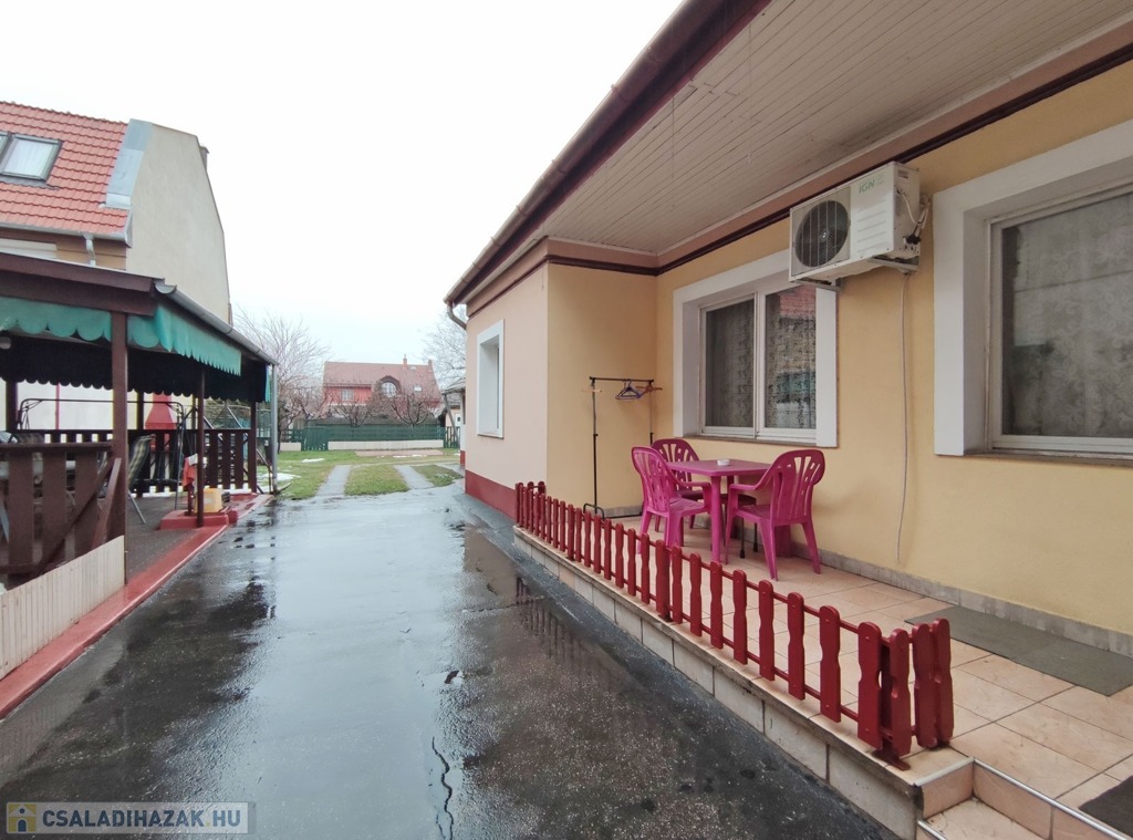 Az udvar végében a különálló, szerelőaknás, 30 nm-es garázs biztosítja a kocsi fedett tárolását. Mellette füves, illetve elkerített gyümölcsfával beültetett nagyon tágas kert található, ami előtt a betonozott részen akár medence is kialakítható.