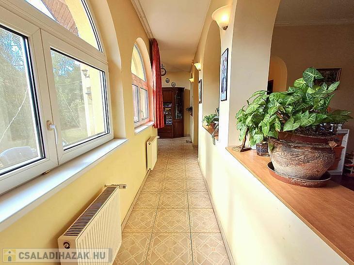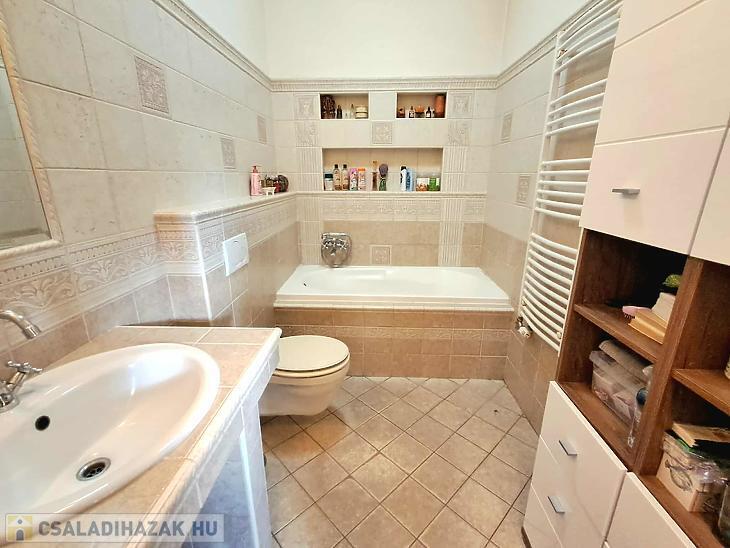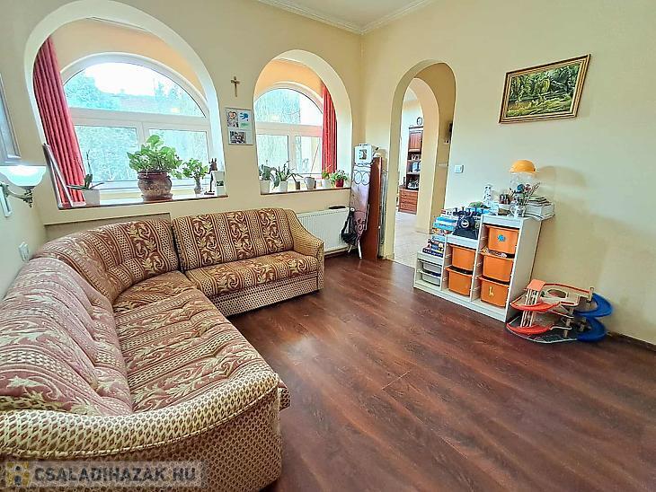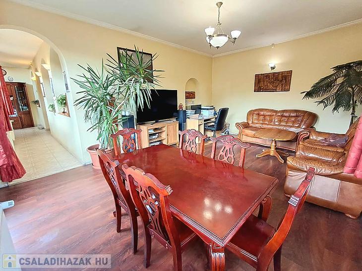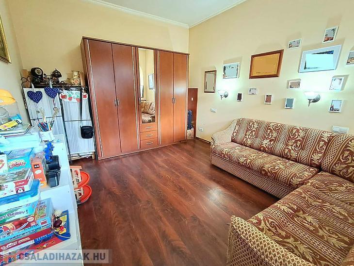 Tágas nappali, 3 szoba (egyik szoba jelenleg étkezőként funkcionál, konyha, 2 fürdőszoba, előszoba és közlekedő áll rendelkezésre. A teljes víz-, villanyhálózat 2010-ben lett felújítva, ekkor történt meg a fűtésrendszer korszerűsítése is. A fűtésről kondenzációs kazán és lapradiátorok gondoskodnak és egy hűtő-fűtő klíma is rendelkezésre áll. A nyílászárók műanyagok, hőszigeteltek, minden ablak szúnyoghálóval van ellátva. A burkolatok szép állapotban vannak. A konyhabútor a vételár részét képezi, a többi berendezés megegyezés tárgya. A nappaliból is megközelíthető a 20 m2-es terasz.