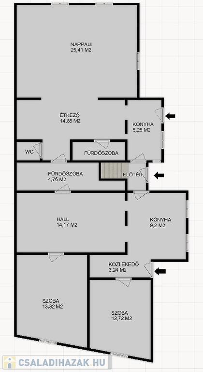 Jelenleg 2 külön főbejárata van a háznak, elosztása lehetővé teszi, hogy a tetőtérben egy harmadik, 60 m2-es lakás kialakítható legyen, saját bejárattal, melynek szigetelésére, lakhatóvá tételére szocpol, családtámogatás is igényelhető. A tetőtér beépítésre kerül, a tavasz folyamán egy 5-ik szoba került itt kialakításra.