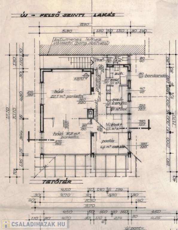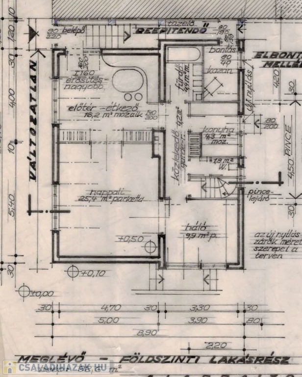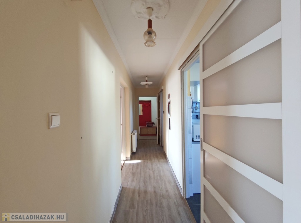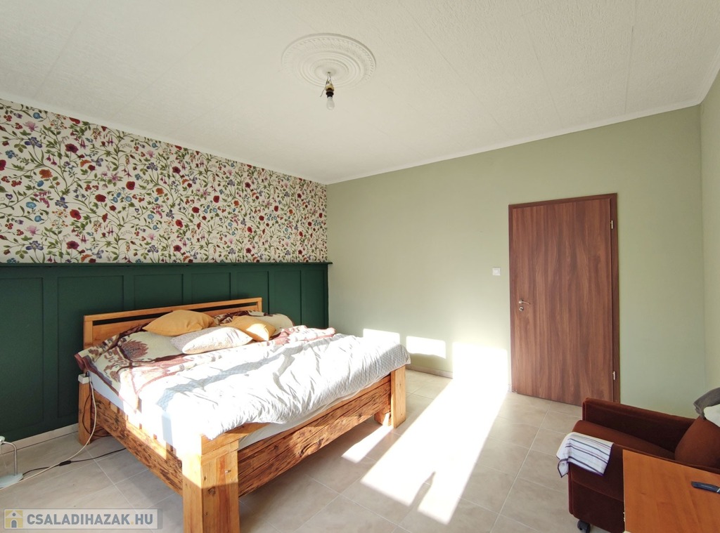 A családi ház az 1950-es évek elején épült betonozott alapzattal, kis pincével, amelyre 1986-ban ráépített a tulajdonosa egy új szintet, cserép héjalással, északnyugati fekvéssel, remek elosztású, szintenként nagyon tágas és világos szobákkal. A ház minden szempontból kellően világos.