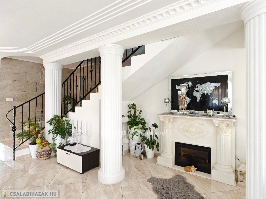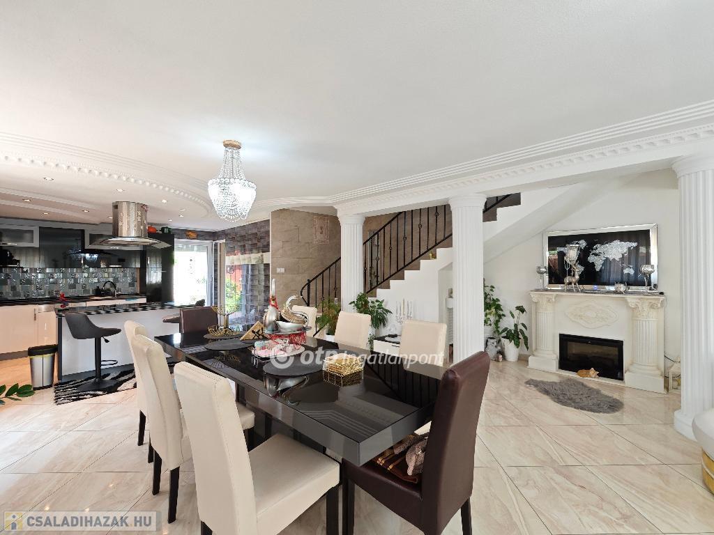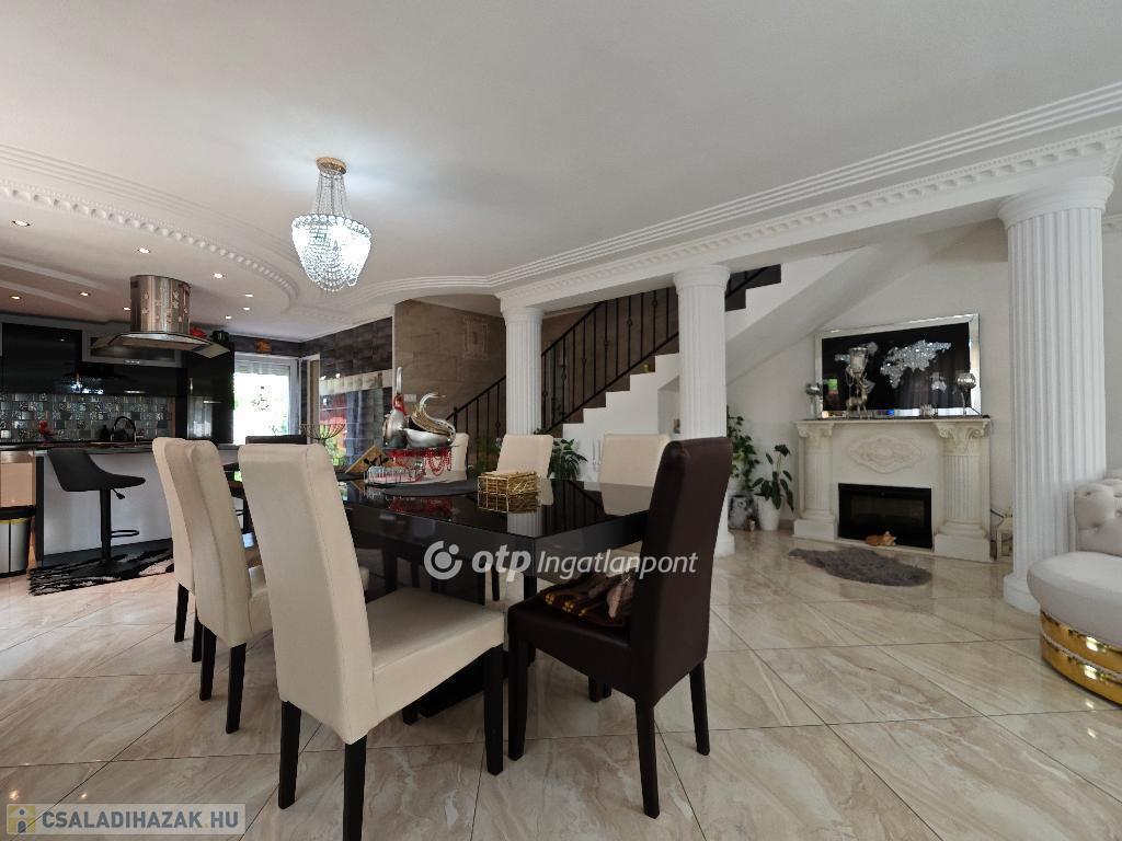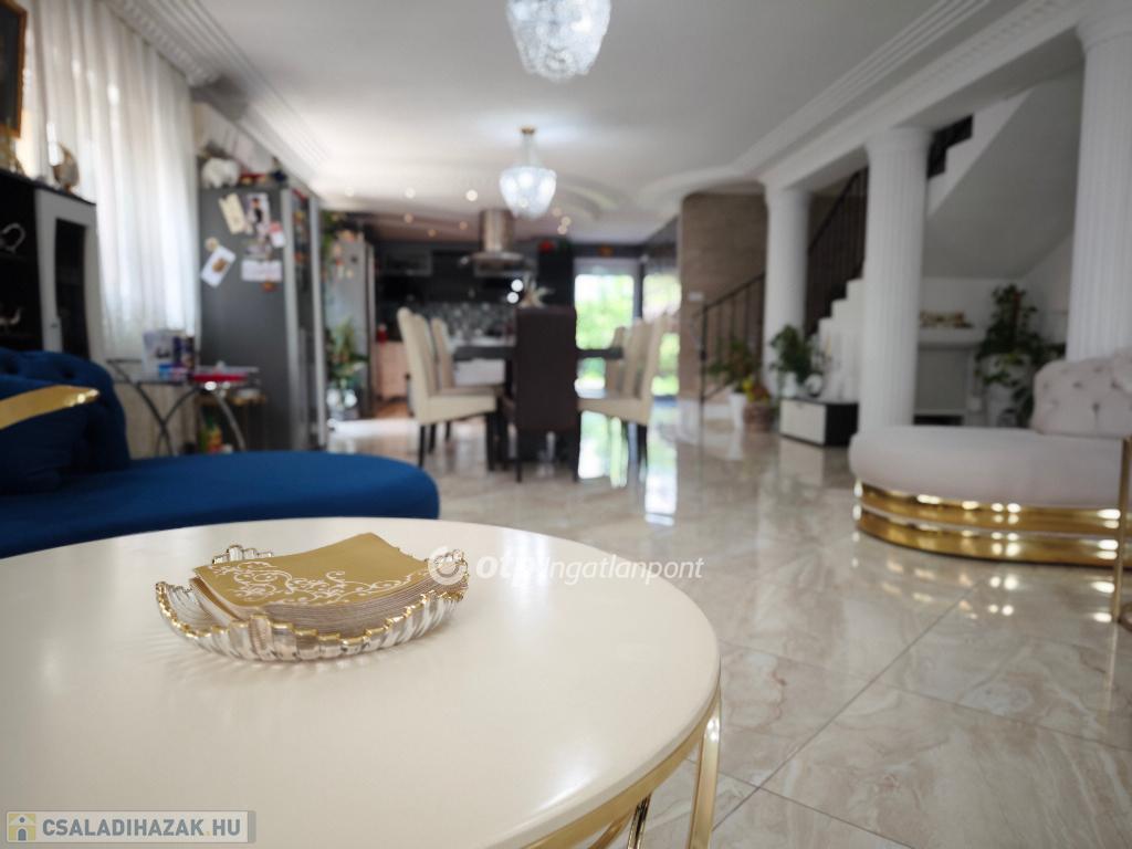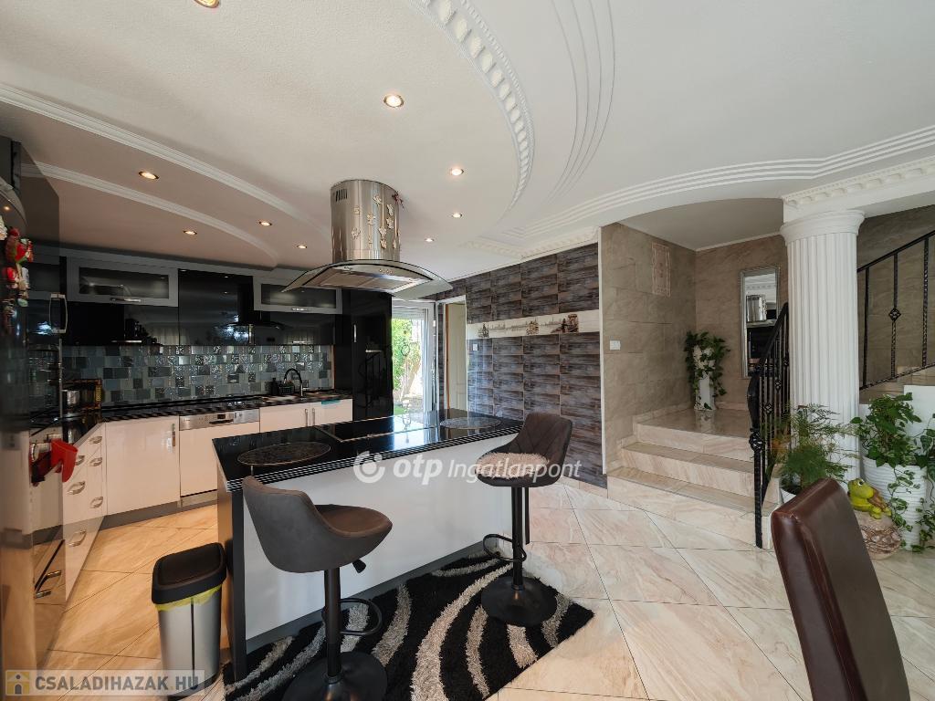 Kétszintes, duplakomfortos, gépesített amerikai-konyhás nappalival és 4 hálószobával rendelkező, berendezett, bútorozott családi ház eladó Budapest XV. kerületében.