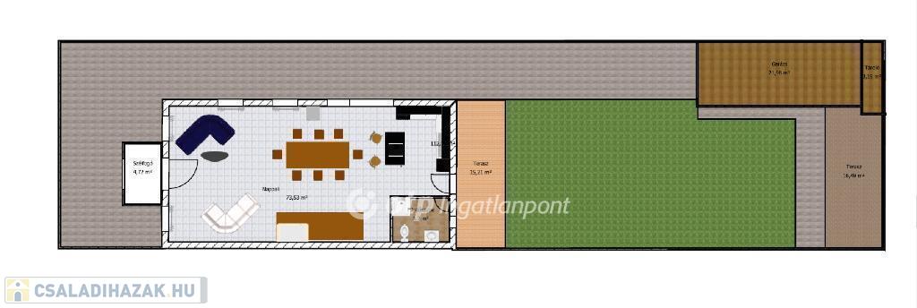 Emellett rendelkezésre áll egy 15 négyzetméteres, a házból közvetlen kapcsolatú terasz és a kert hátsó részében pedig egy közművesített (víz, villany) 16,5 nm-es fedett terasz saját kemencével.