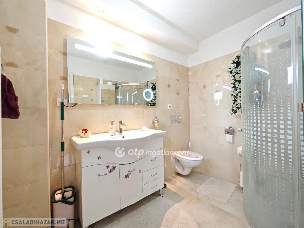 A felső szint ideális méretű fürdőszobája káddal és wc-vel is felszerelt, de kényelmesen elfér a mosó-, és szárítógép is.