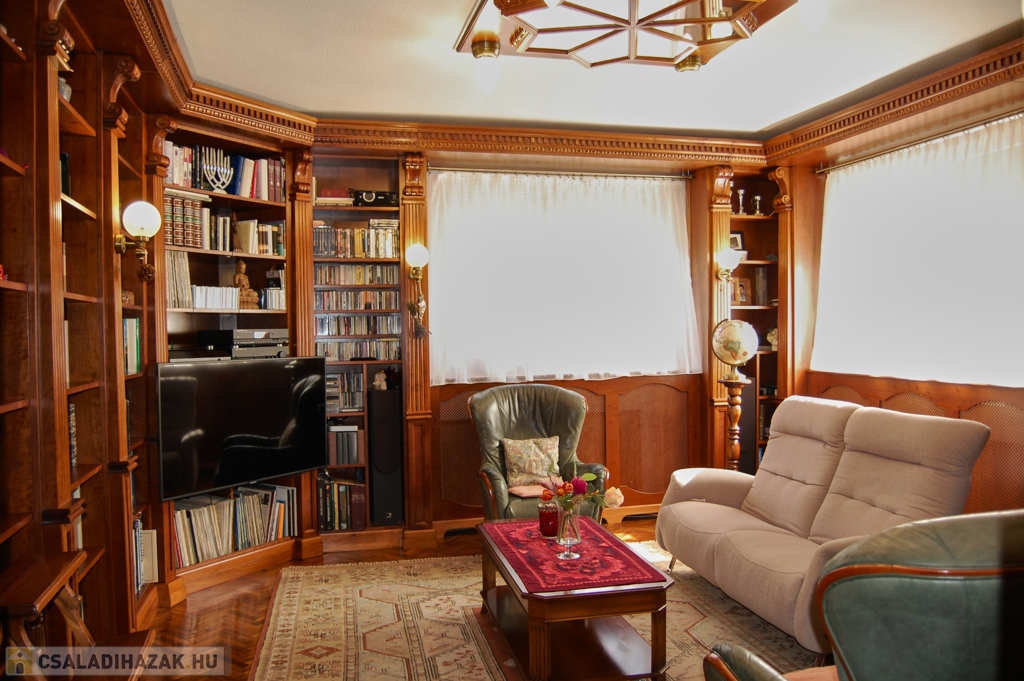 Beépített könyvtárszoba – tömör cseresznyefa polcrendszerrel, déli benapozással