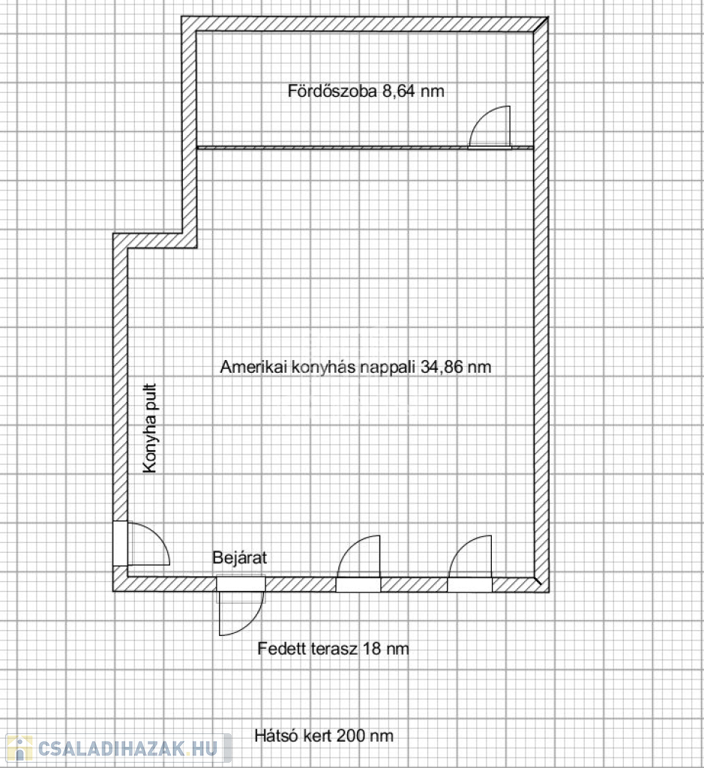 Alapterülete 44 nm, jelenleg 1 nagy szobás, amerikai konyhás elosztású, de könnyedén 1,5-2 szobássá alakítható több féle alaprajzi lehetőséggel.