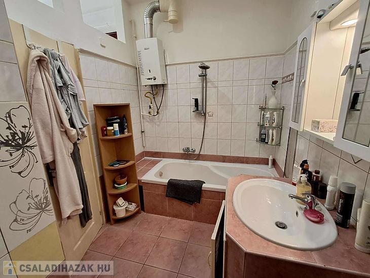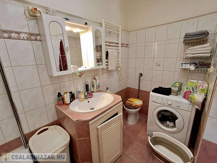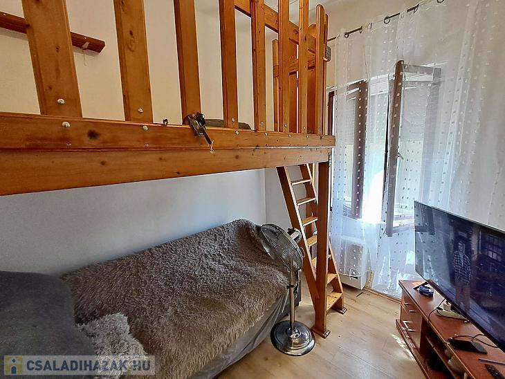 Amerikai konyhás nappali, galériázott szoba, gardrób, fürdőszoba és előszoba áll rendelkezésre. A víz-, villanyhálózat a 2000- évek elején lett korszerűsítve. A burkolatok jó állapotban vannak, a szoba laminált parkettás, a többi helyiség járólapos. A nyílászárók fakeretesek. A fűtést gázkonvektor biztosítja, kiegészítő fűtésként hűtő-fűtő klíma is rendelkezésre áll. A konyhabútor és a beépített bútorok a vételár részét képezik. Tartozik a lakáshoz egy 15 m2-es kertrész, ami igény szerint lekeríthető és egy 5 m2-es tároló.