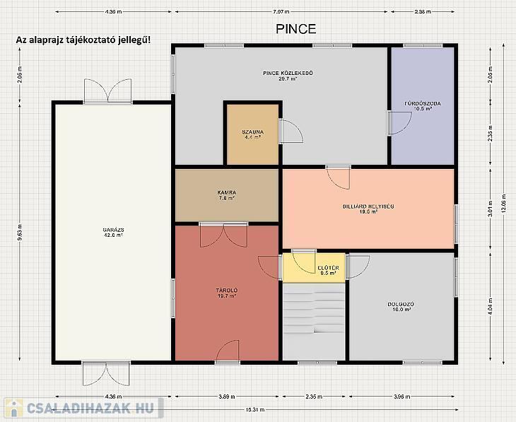 Az épület három szinten helyezkedik el. A földszint 144 m² alapterületű, ahol előtér, nappali, két hálószoba, konyha, étkező, fürdőszoba, külön mellékhelyiség és terasz található. Az emelet 126 m²-es, itt egy előtér, hat hálószoba, valamint egy mellékhelyiséggel ellátott fürdőszoba került kialakításra. A pince szint 114 m²-es, ahol közlekedő, szauna, fürdőszoba, kamra, dolgozószoba, biliárd helyiség, tároló és garázs kapott helyet.
