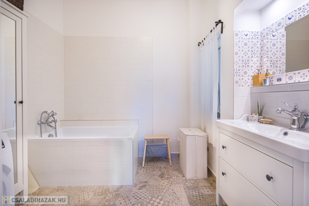 Az alsó és a felső szinten is teljes értékű fürdőszoba található, lent külön, fent egy helyiségben a WC-vel. Lent található háztartási helyiség is. A 4 hálóból egy dolgozó, 3 pedig nagy méretű, teljes értékű, de a dolgozó felől található a műhely, mely irányába könnyen bővíthető a szoba, így a ház mind az alsó, mind a felső szinten.