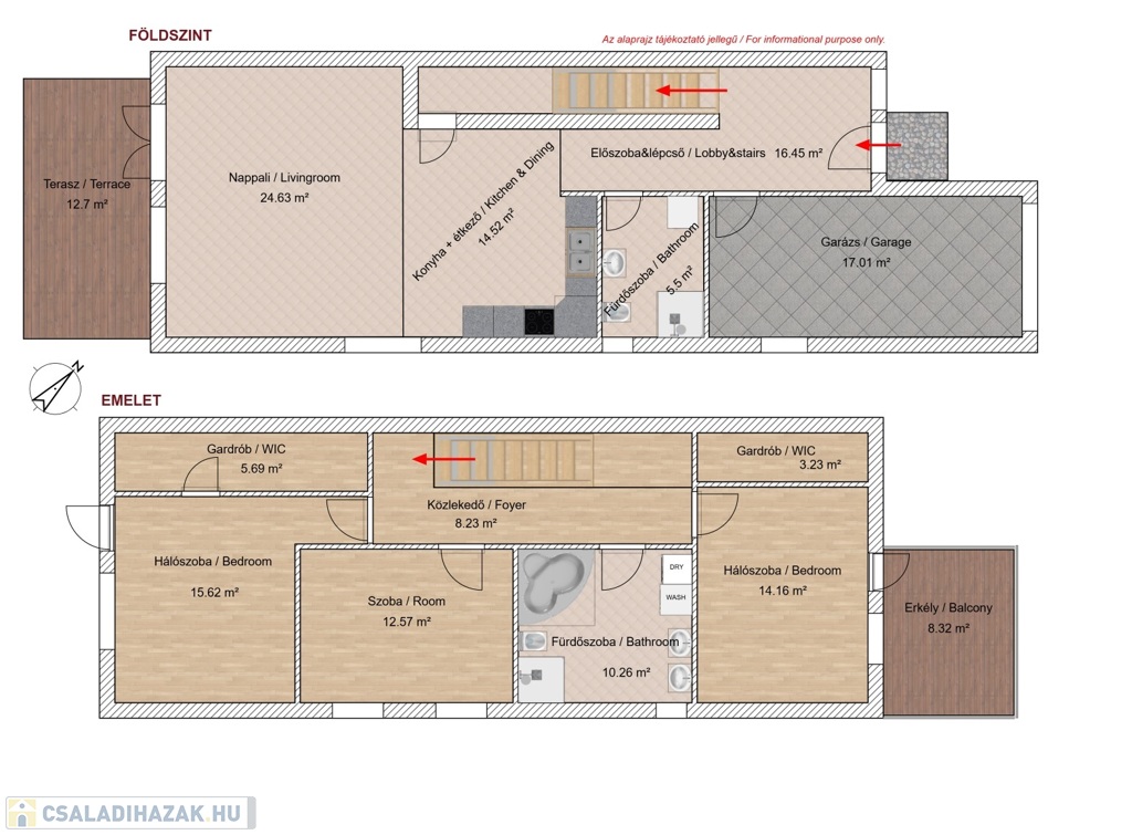 Duplakomfort: 2 fürdőszoba, 2 wc, zuhanyzó + kád, minden szinten mosógép csatlakozással