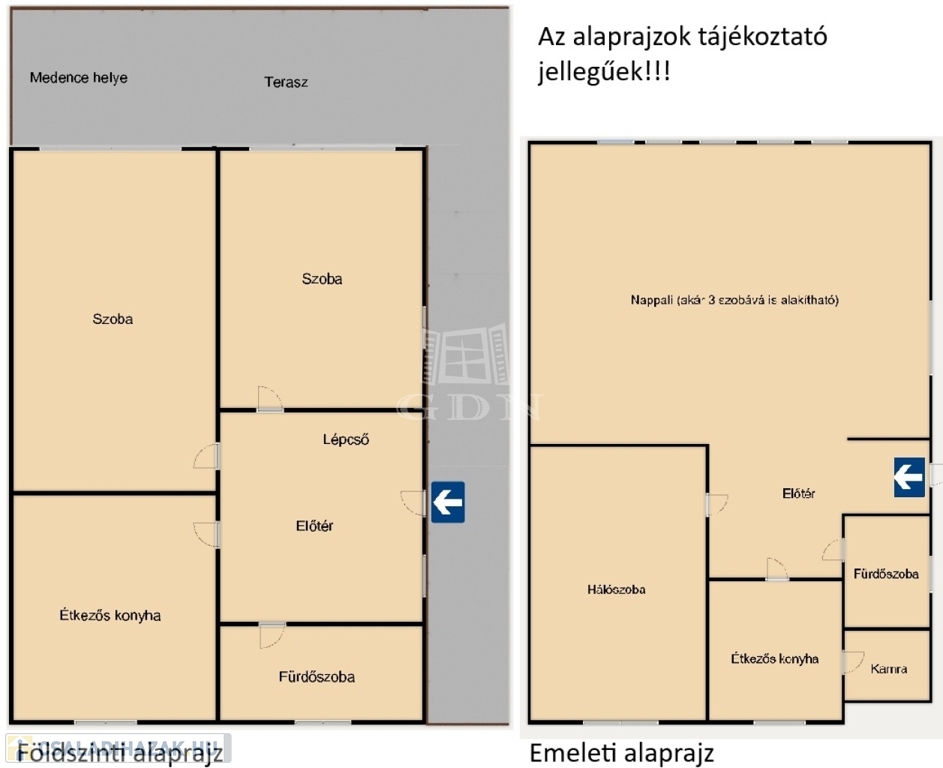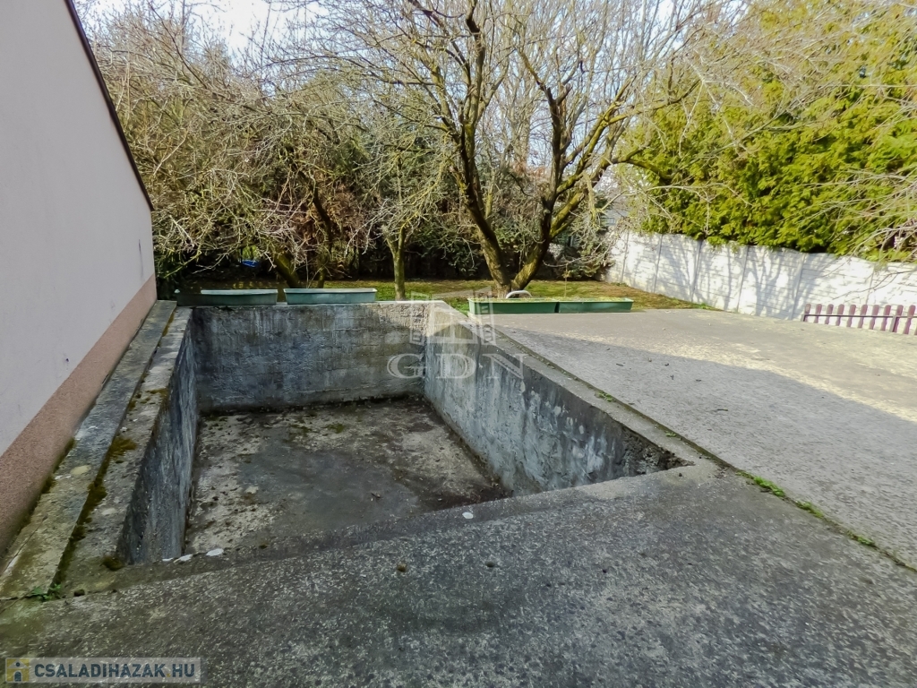 A földszinti részen kényelmes előtér, 2 szoba, nagy étkezős konyha, fürdőszoba, lépcső fel - és lejáró, terasz (esetleges medence kialakítással) kapott helyet.