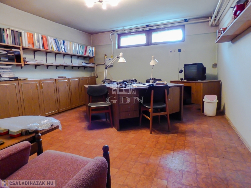 A pinceszinten iroda, amely akár hobby szobaként is funkcionálhat, tárolók, kazánhelyiség, wc, kézmosó és egy fűthető dupla garázs található.