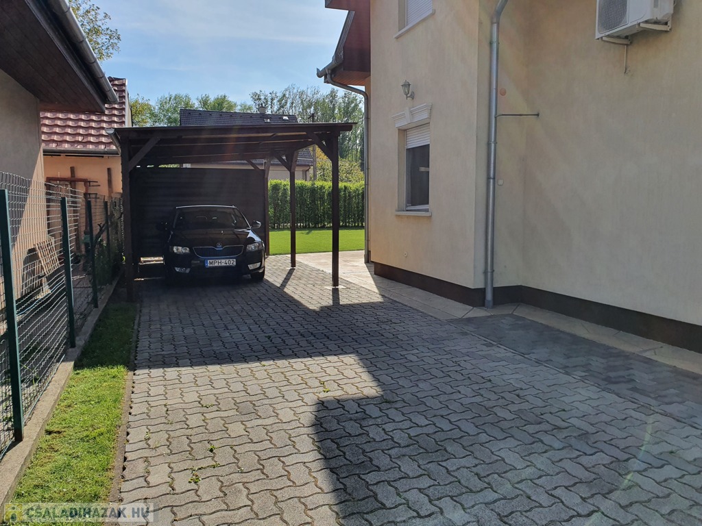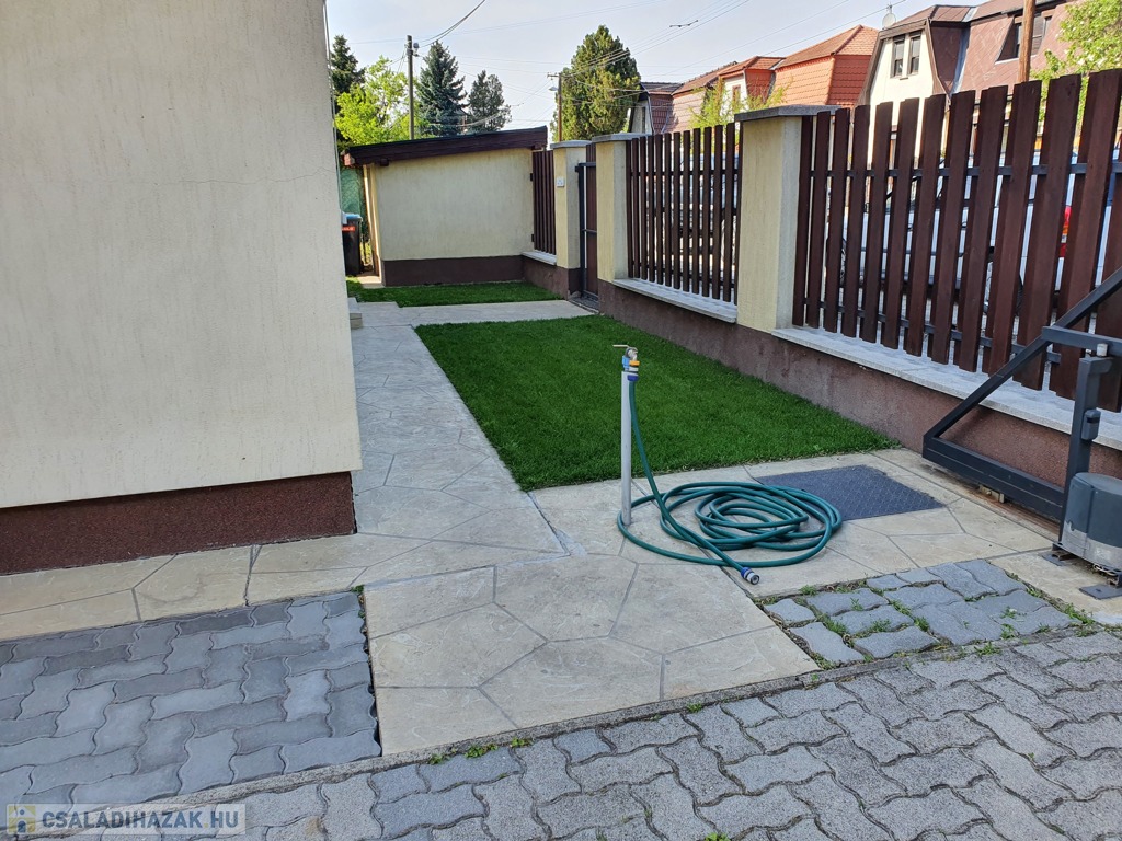 Az 550m2 es kert rendezett, 3 autó számára autóbeállóval / 1 fedett /, távirányítású kapuval, kerti és mozgásérzékelős világítással, kerti csappal, fúrt kúttal, kerti sütővel valamint 5m2 es zárható tároló épülettel.