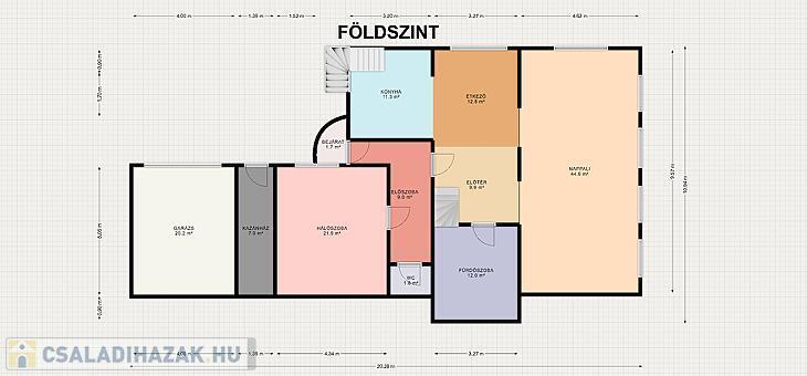 Földszint: Előtér, amerikai konyhás nappali, hálószoba, kamra, fürdőszoba, lépcsőház