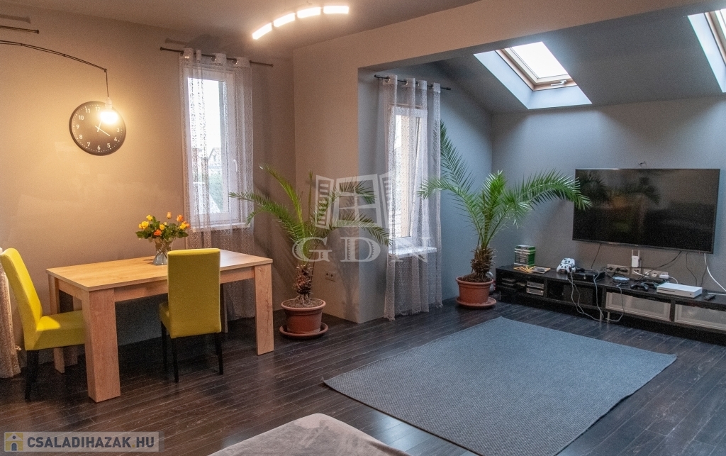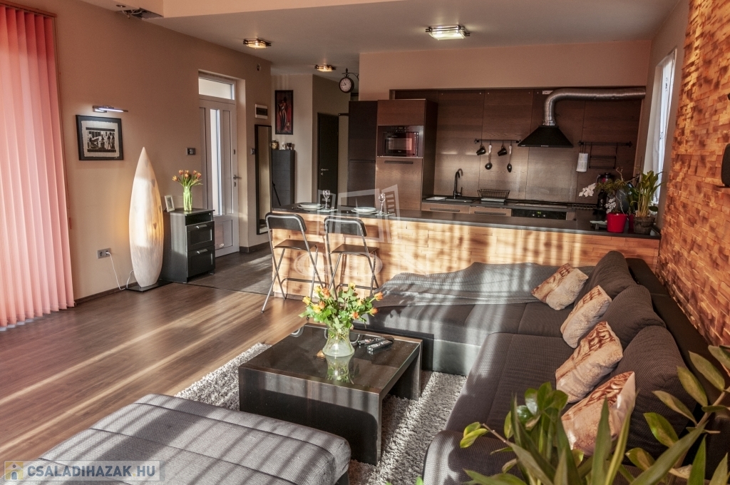 3. EMELETI LAKÁS: 121nm lakóterületű, mely nappali, konyha, 3 hálószoba, 2 fürdőszoba, mellékhelyiség, gardrób, tárolóhelyiség kialakítású, azonban a nappaliból feljutva a tetőtérbe megoldható további 2 szoba kialakítása is.