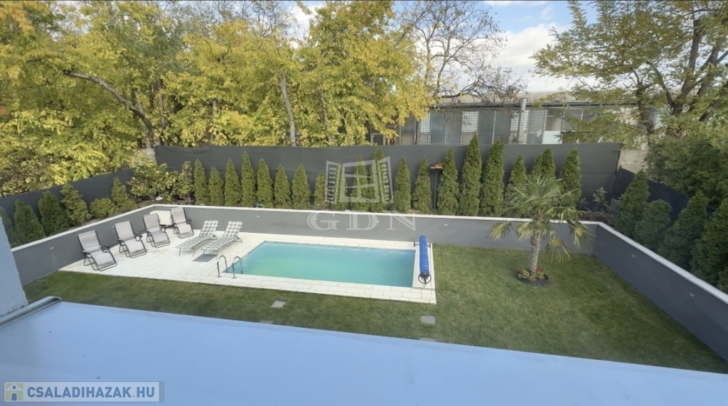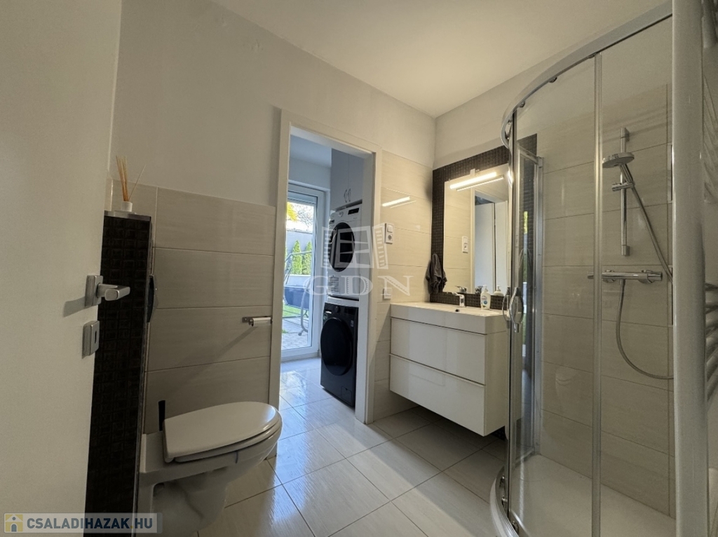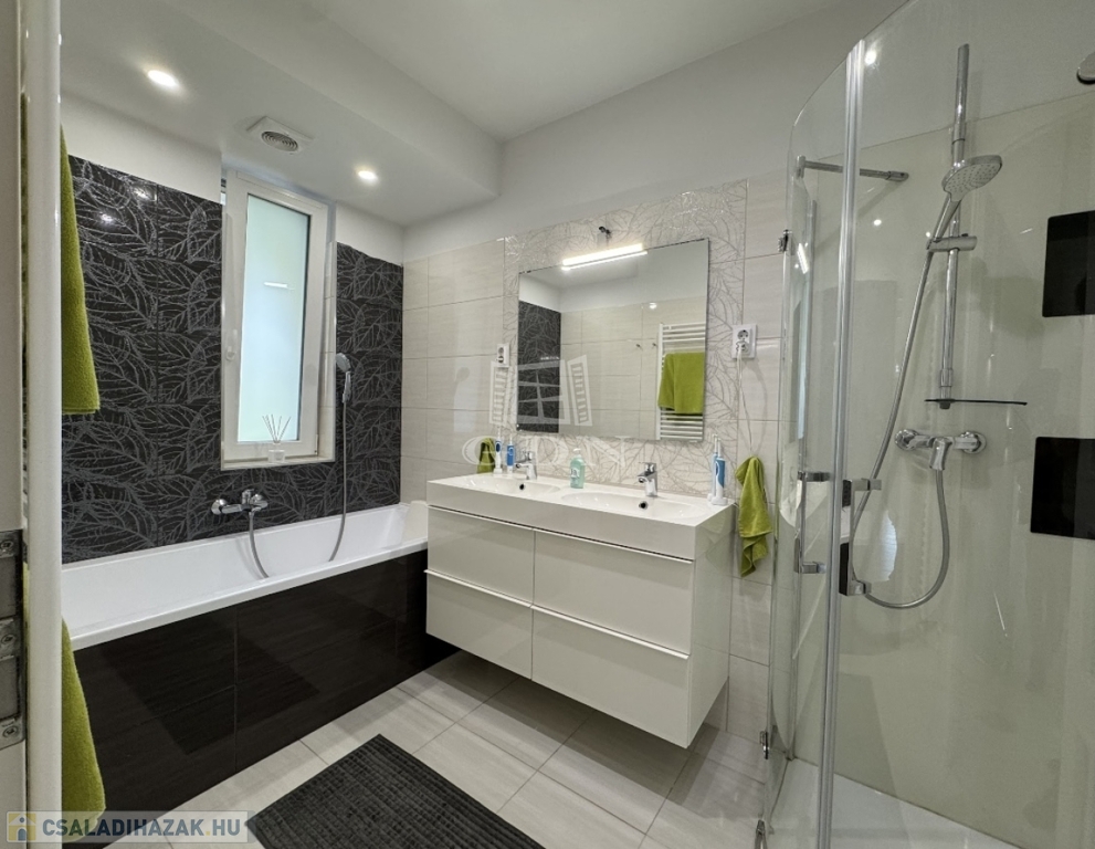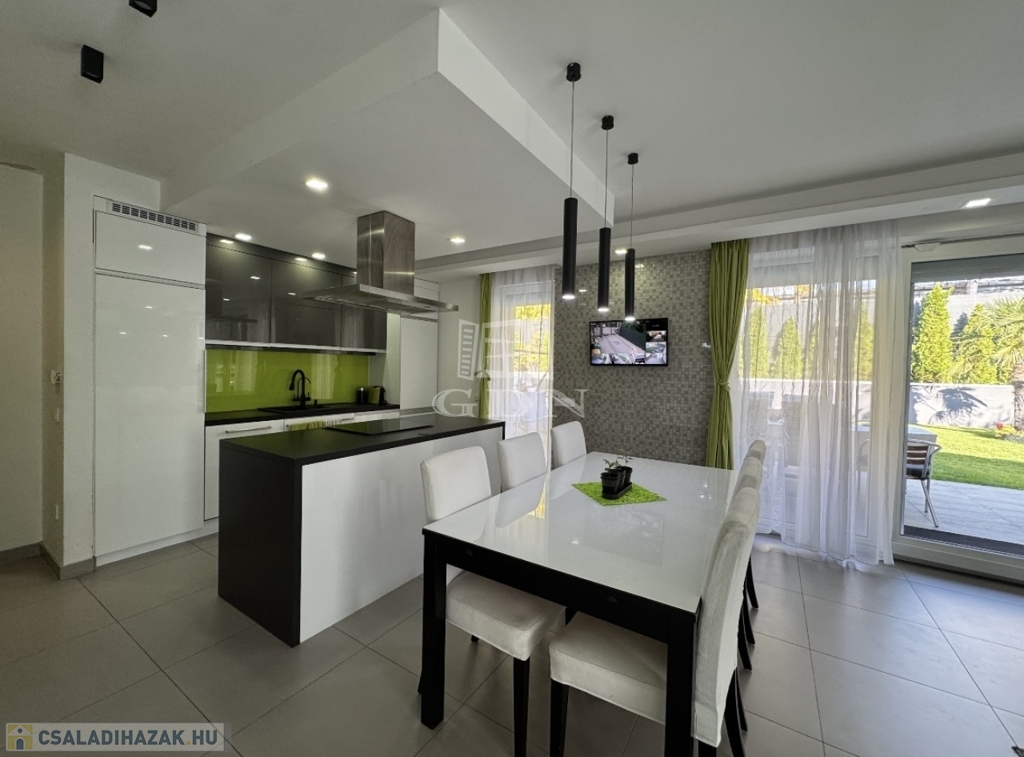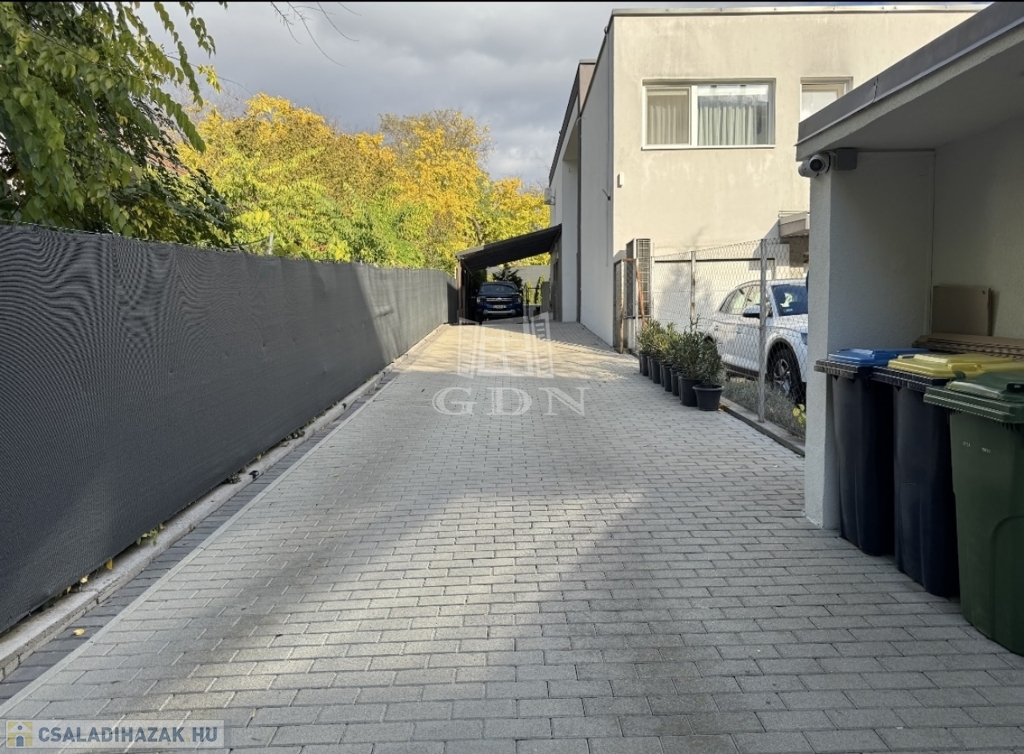 Sashalmon, a Kicsi utcában eladó egy 214 m²-es, prémium kivitelezésű, kétszintes ikerházfél két külön lakóegységgel – akár egybenyitható kialakítással.