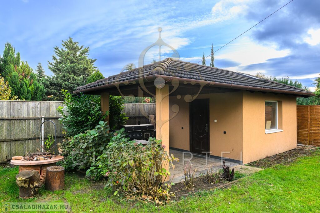 A földszinten egy világos nappali, két külön nyíló szoba, egy fürdőszoba káddal és tusolóval, valamint egy szeparálható konyha található, amelyhez kamra is tartozik. A nappali előtt egy széles, fedett terasz nyílik a hátsó kert felé, amely zavartalan pihenést biztosít.