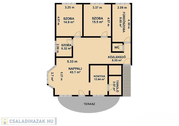 Emelet: 3 szoba, nappali, konyha, fürdőszoba, wc, tároló, terasz, közlekedő.