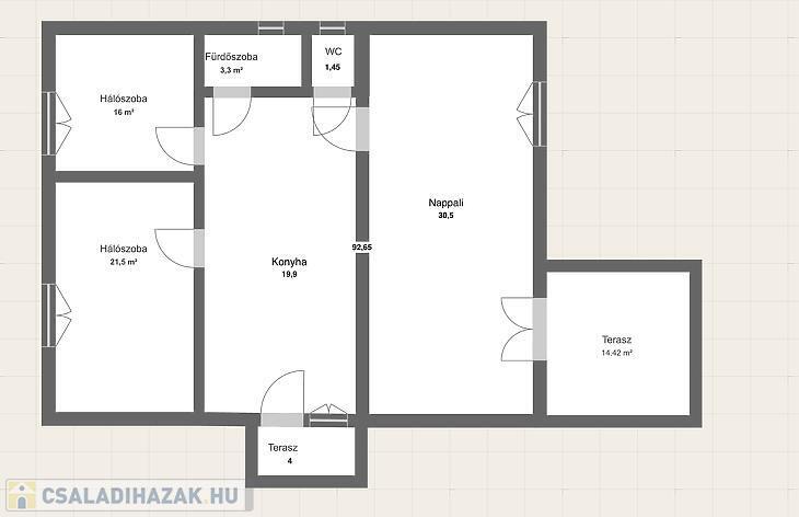 Nappali, 2 szoba, előszoba + konyha + étkező, zuhanyzós fürdőszoba, külön wc, terasz, szélfogó.