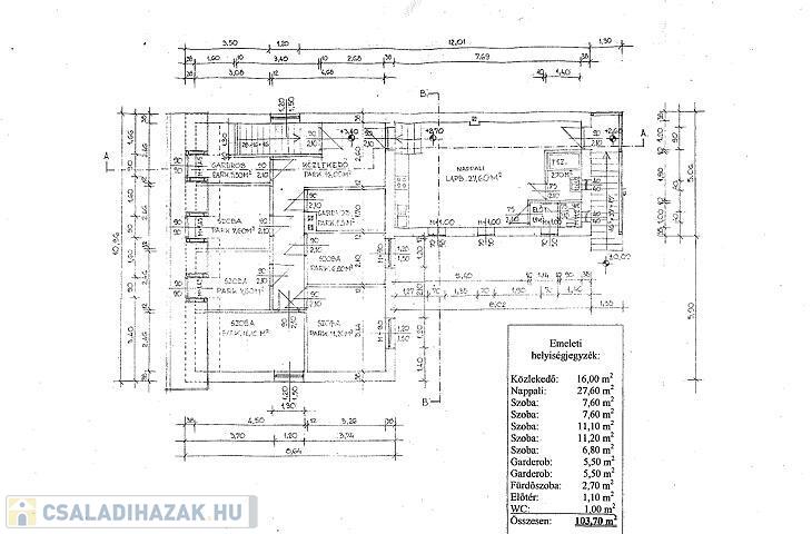 Emelet: 5 szoba, nappali, fürdőszoba, wc, 2 gardrób, előtér, közlekedő.
