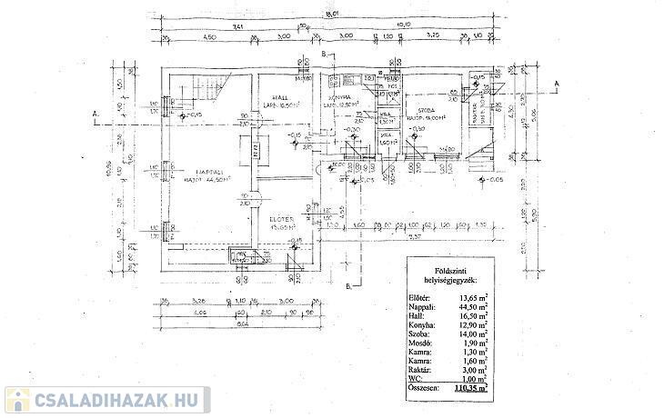 Földszint: Előszoba, hall, nappali, konyha + étkező, kádas fürdőszoba, 2 wc, 2 kamra, előtér, raktár.