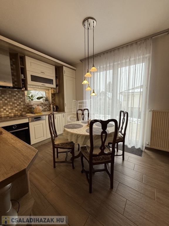 A nappaliból közvetlenül nyílik a földszinti hálószoba, az étkező pedig teraszkijáratos, így a belső tér és a kert kapcsolata természetes és kényelmes.