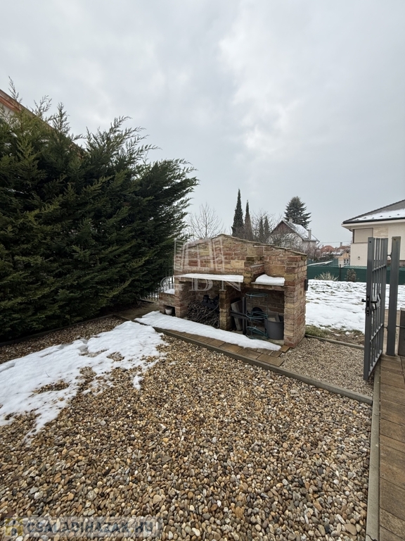 A szépen gondozott udvaron egy külön elkerített, hangulatos kerti sütögető rész került kialakításra – tökéletes helyszín családi és baráti összejövetelekhez.