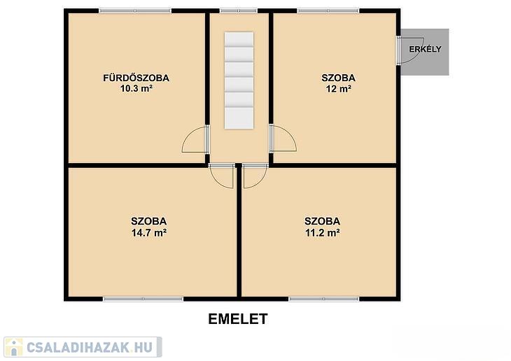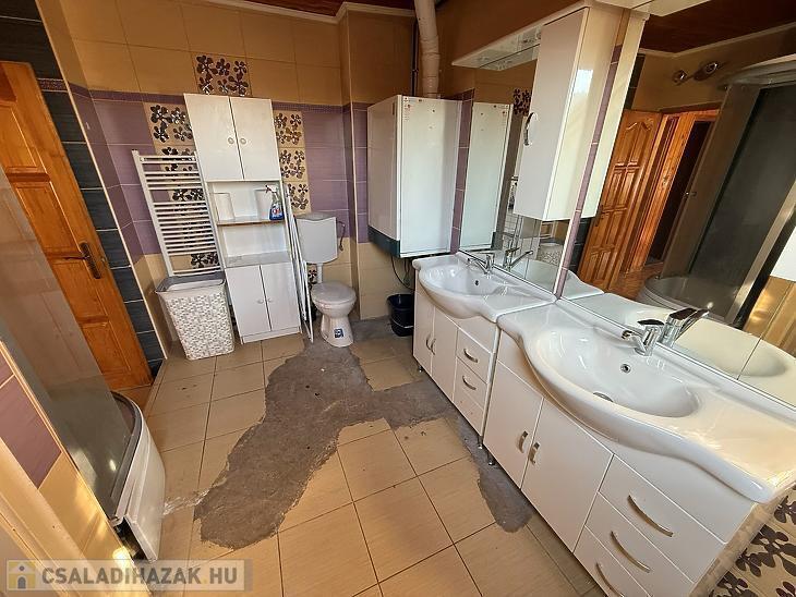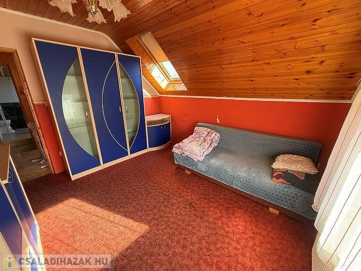 Emelet: 3 szoba, zuhanyzós fürdőszoba + mellékhelyiség, közlekedő, erkély.