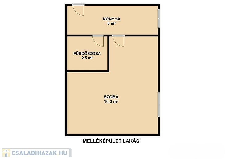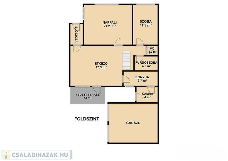 Földszint: nappali, szoba, konyha, étkező, zuhanyzós fürdőszoba, mellékhelyiség, közlekedő, előszoba, kamra, 14 négyzetméteres terasz.