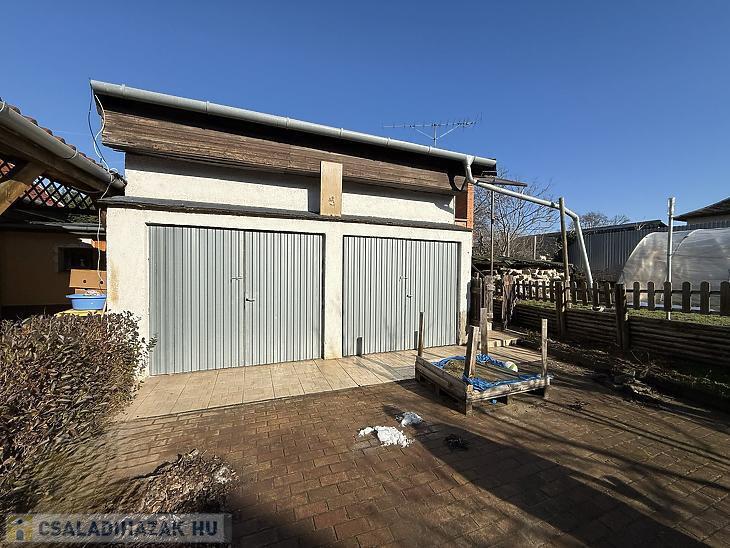 A házhoz tartozik egy szerelőaknás, kétállásos garázs is, mely fölött található egy 18 négyzetméteres, felújítandó kis lakás is.
