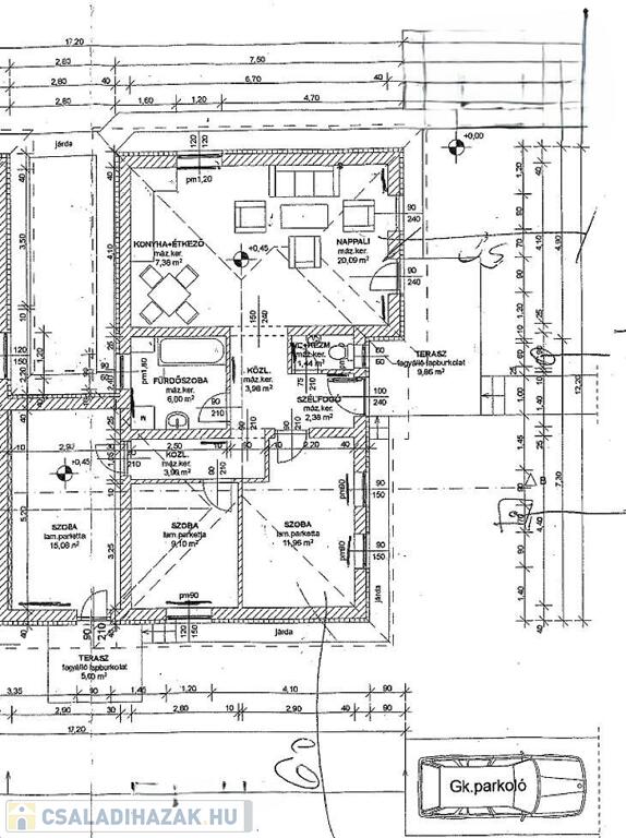 Amerikai konyhás nappali + étkező 10 négyzetméteres teraszkapcsolattal, 3 szoba, kádas fürdőszoba + wc, külön wc, közlekedő, előszoba.