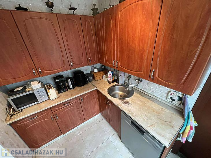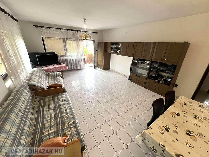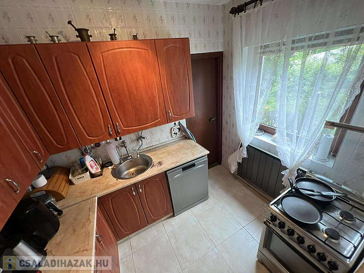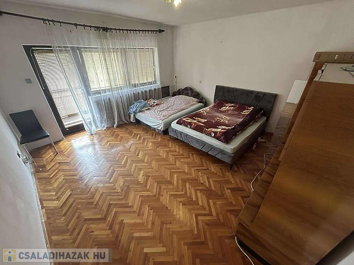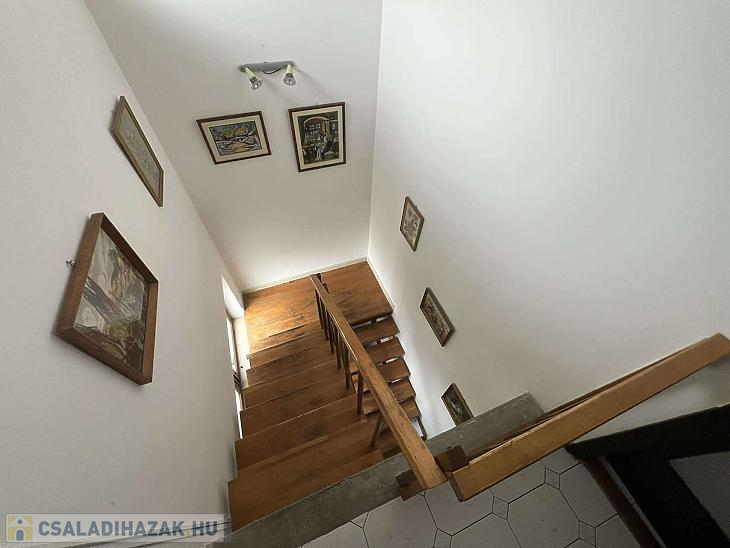 Emelet: 2 szoba, étkezős nappali, konyha, sarokkádas fürdőszoba, mellékhelyiség, 2 erkély. kamra.