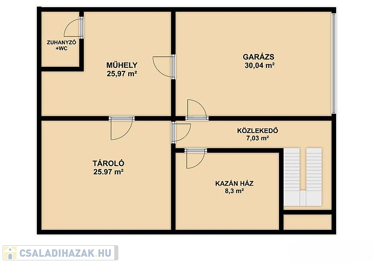 Szuterén: Kazánhelyiség, 2 tároló, zuhanyzó + mellékhelyiség, garázs.