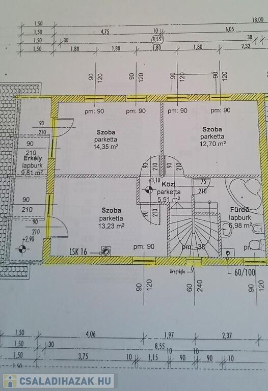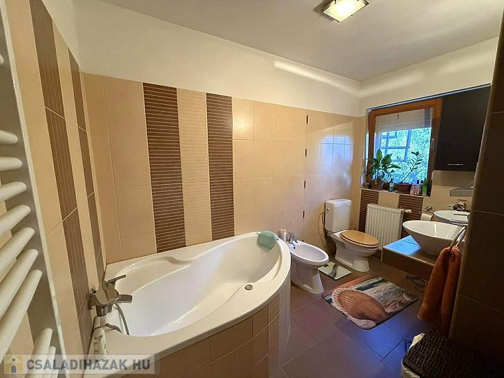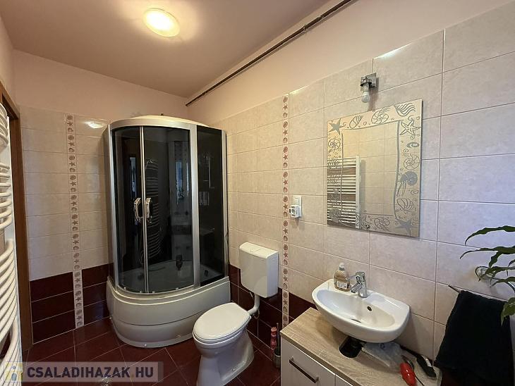 Emelet: 3 szoba, kádas fürdőszoba + wc, közlekedő, erkély.