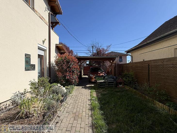 XVII. KERÜLETBEN, RÁKOSCSABA-ÚJTELEPEN ELADÓ EGY 110 NM-ES, JÓ ÁLLAPOTÚ, KÉTSZINTES IKERHÁZFÉL, 215 NM-ES TELEKKEL, TÁROLÓVAL ÉS FEDETT KOCSIBEÁLLÓVAL.