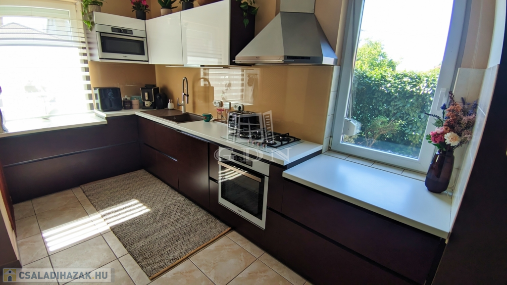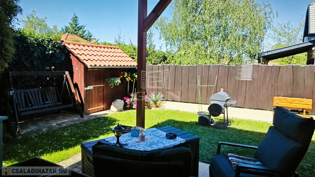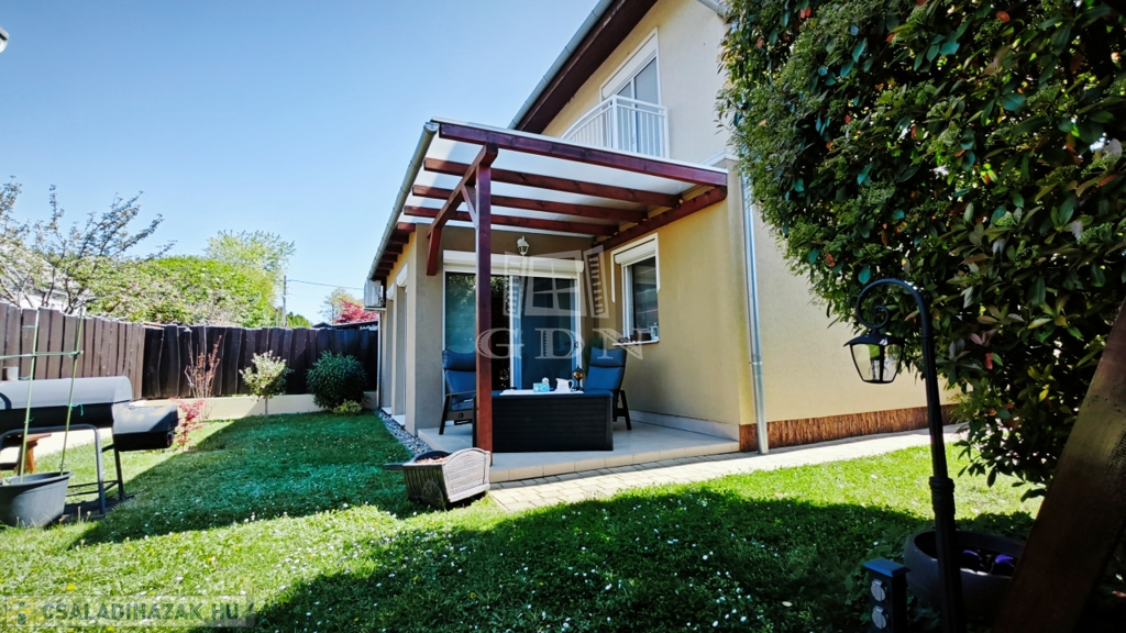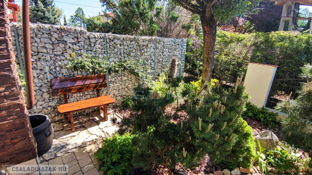 A 320 m²-es telket kerttervező cég álmodta meg, így a gondozott kert tökéletes kiegészítője az elegáns otthonnak. A hátsó kertből közvetlen kijárás nyílik a fedett teraszról, amely a 2012-ben hozzáépített, 13 m²-es szinteltolásos dolgozószobán keresztül közelíthető meg – itt padlófűtés is növeli a komfortérzetet.