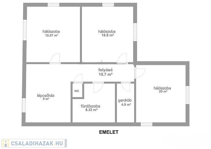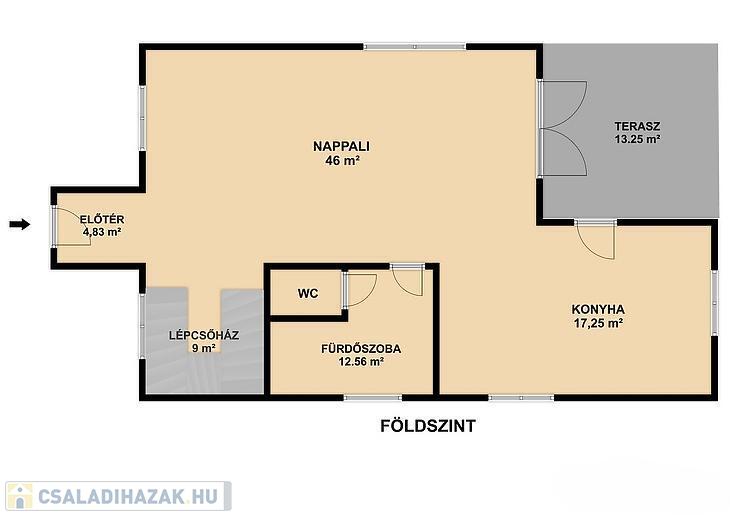 Magasföldszint: tágas, amerikai konyhás nappali (innen nyílik a nagy terasz), fürdőszoba és külön mellékhelyiség, közlekedő és lépcsőház.