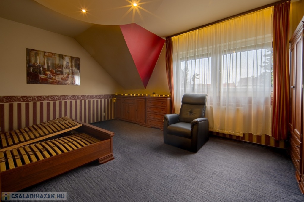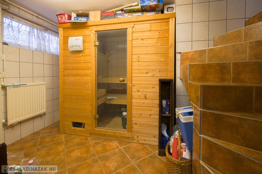 A pinceszinten nagy tároló, két állásos garázs, szauna és háztartási helyiség található, valamint a kertbe közvetlen kijárás is megoldott. A földszinten konyha, étkező/szoba, hatalmas nappali és 21 m2-es, kertkapcsolatos terasz, zuhanyzós fürdő-WC, valamint kamra, az emeleten további 4 hálószoba és egy sarokkádas fürdőszoba található.