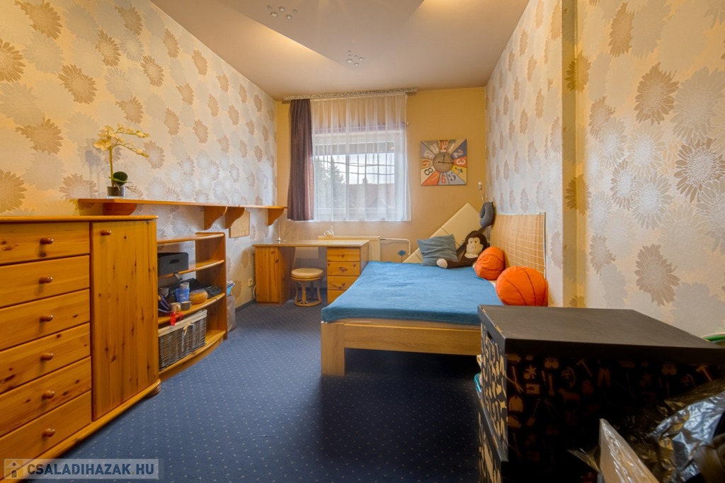 A XVII. kerület legszebb, családi házas övezetében, Madárdombon eladó egy 3 szintes (pince, földszint, emelet), 5 hálószobás, duplakomfortos, kertes, teraszos, dupla garázsos, 1994-ben épült, remek állapotú családi ház. Szintenként nettó 81 m2, a pinceszint és a földszint nettó, az emelet bruttóban, a nettó 76 m2 - a nettó lakótér 162 m2, ebbe nincs beleszámolva sem terasz, sem a garázs és a pinceszint.