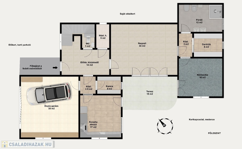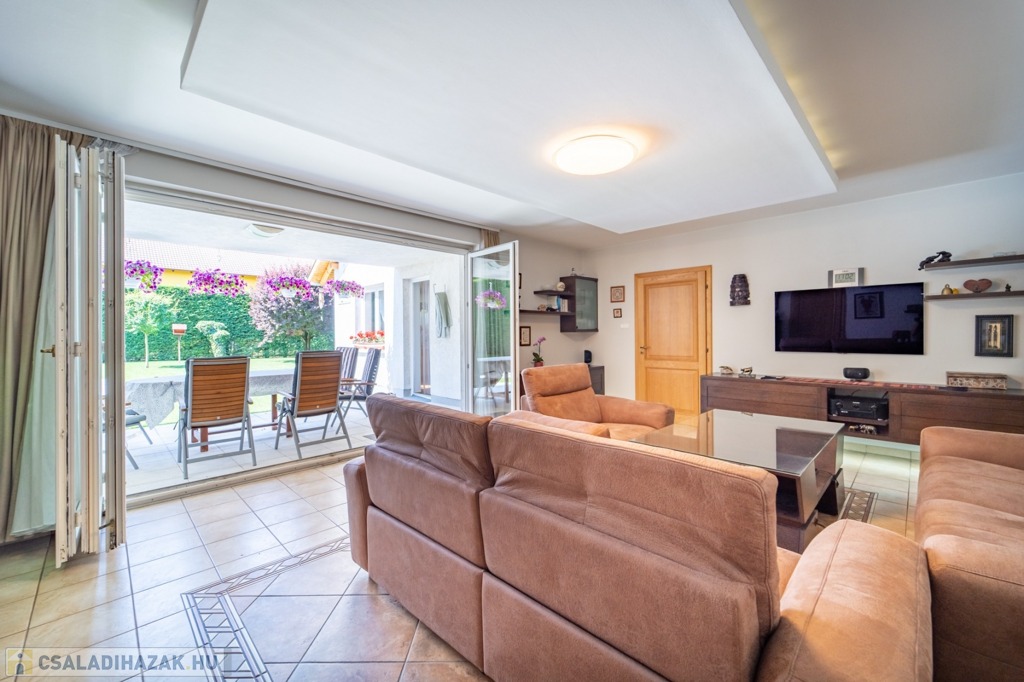 Az előkertben egy nagyméretű, akár lakóautó tárolására is alkalmas, féltetővel kialakított autóbeálló is helyet kapott. A garázs és a főkapu is elektromosan nyitható, a kertész által rendbentartott kertben autómata öntözőrendszer öntöz, a medencének is komplett vezérlése, világítása van az autómatizáláshoz, ráadásul fűthető, napkollektorról.