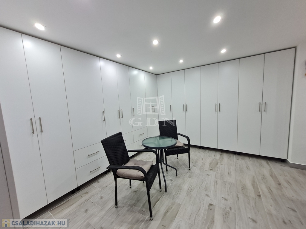 A kiskapu és a nagykapu távirányítású. A garázs mellett, kerten belüli parkolás is megoldott.