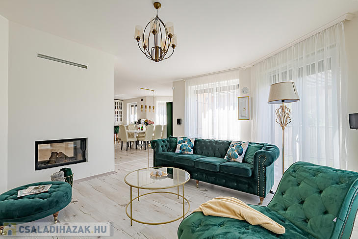 Az alsó szinten padlófűtés, míg a ház többi helyiségében radiátor gondoskodik a ház melegéről. A nappaliban található egy 12 kW-os belső égésterű kandalló.