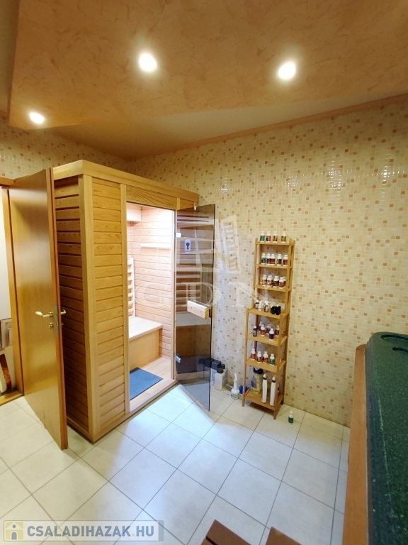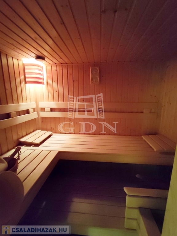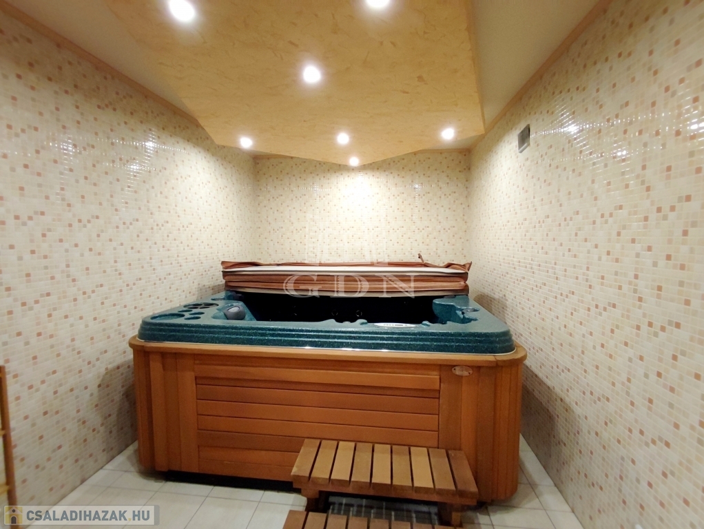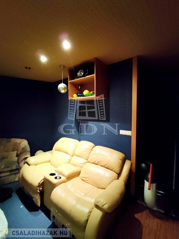 Az alsó szinten helyezkedik el a dupla GARÁZS tárolóval és gépészeti helyiséggel, továbbá egy WELLNESS-részleg jacuzzival, szaunával, infra szaunával és fürdőszobával. A MOZISZOBA vászonnal, projektorral és kényelmes bőrfotelekkel felszerelt.